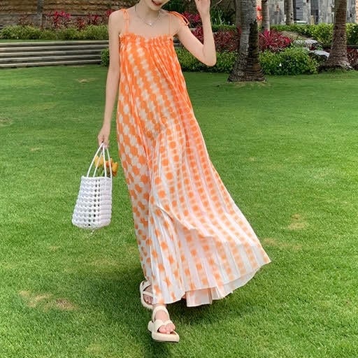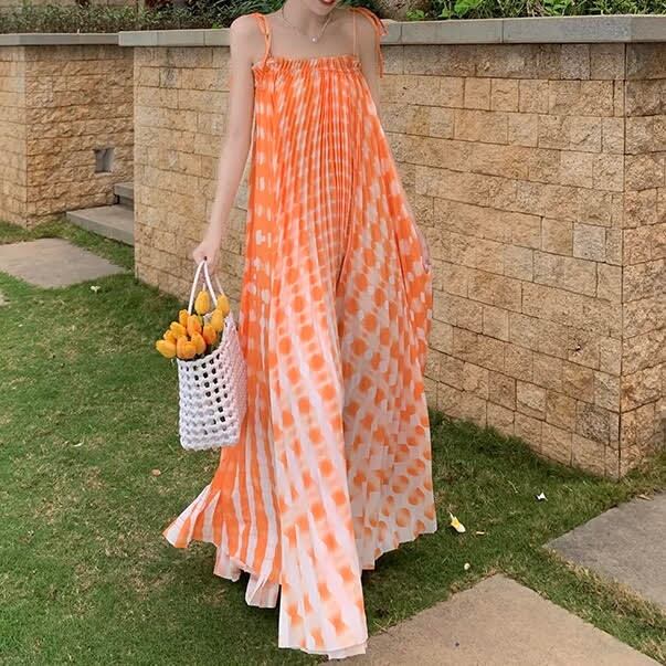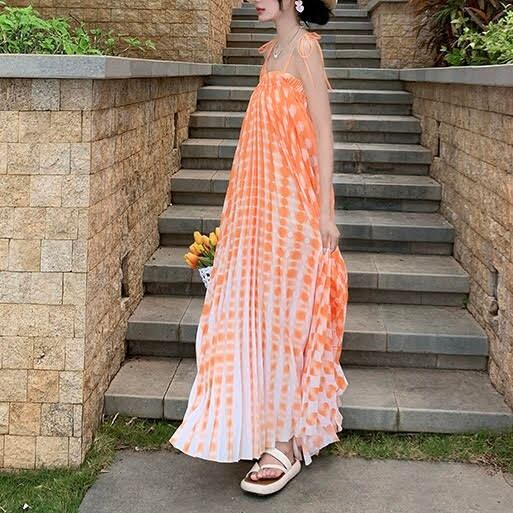 レディース ワンピース ノースリーブ サスペンダー ロング丈 プリーツ Aライン グラデーション ルーズ きれいめ 上品 おしゃれ お洒落 大人可愛い 大人女子 かっこいい スタイリッシュ セクシー エレガント キュート ラブリー ガーリー フェミニン レトロ 主役級 存在感 こなれ感 抜け感 夏 10代 20代 30代 お出かけ デート 女子会 旅行 お泊まり リゾート 海 ビーチ ショッピング 休日 普段使い 韓国 オルチャン ファッション コーデ トレンド スタイル 脚長 S M L XL オレンジ