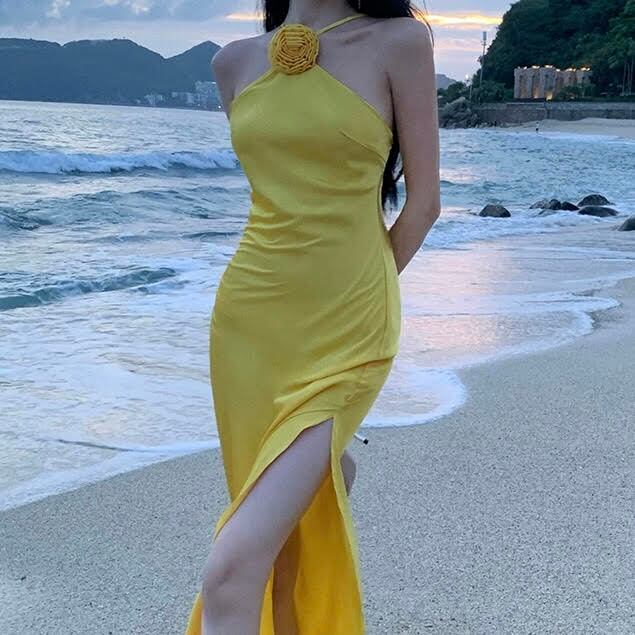 レディース ワンピース ノースリーブ ホルターネック ロング丈 サイドスリット バックレス タイト スリム 細身 きれいめ 上品 おしゃれ お洒落 大人可愛い 大人女子 かっこいい スタイリッシュ セクシー エレガント クール モダン フェミニン レトロ 主役級 存在感 こなれ感 抜け感 夏 20代 30代 40代 お呼ばれ イベント パーティー お出かけ デート 女子会 旅行 お泊まり リゾート 海 ビーチ 韓国系 オルチャン ファッション コーデ トレンド スタイル 脚長 美脚 S M L イエロー