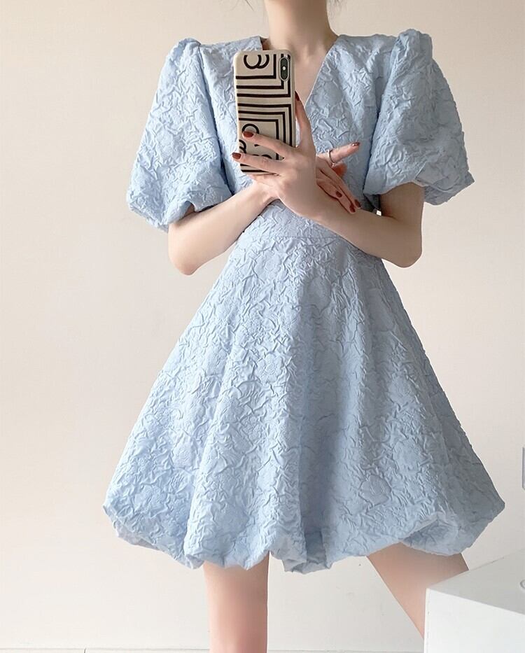 レディース ワンピース ドレス ショート 半袖 パフスリーブ Vネック Aライン ファスナー ハイウエスト 大人可愛い きれいめ 上品 おしゃれ ラフ ガーリー クール エレガント 主役級 存在感 フォーマル 都会的 ロマンティック ナチュラル 無地 春 夏 結婚式 二次会 披露宴 発表会 デート お出かけ パーティー イベント レストラン 女子会 休日 ホテル ショッピング コンサート 韓国 コーデ 楽ちん プレゼント 美脚 脚長 モテ インスタ映え S M L ライトブルー