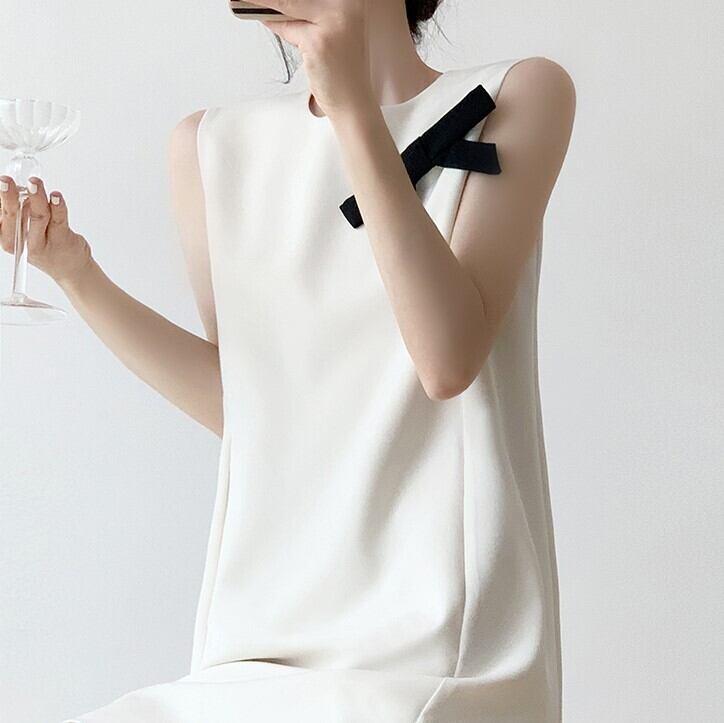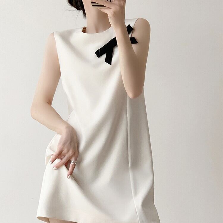 レディース ワンピース ドレス ショート ノースリーブ ラウンドネック Aライン リボン 大人可愛い きれいめ 上品 おしゃれ ラフ ガーリー クール エレガント 存在感 フォーマル 都会的 ナチュラル 無地 春 夏 結婚式 二次会 披露宴 発表会 デート お出かけ パーティー イベント レストラン 女子会 休日 ホテル コンサート フェス 韓国 コーデ 楽ちん プレゼント モテ インスタ映え S M L ホワイト