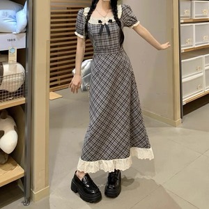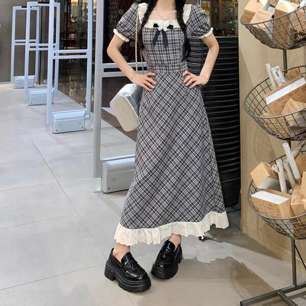 レディース スカート ワンピース オールインワン ロングスカート ロング アンクル丈 半袖 パフスリーブ スクエアネック セミフレア スリム 細身 Aライン 切り替え フェミニン レース フリル リボン スリット ファスナー ハイウエスト ヴィンテージ かわいい 大人可愛い 上品 おしゃれ レトロ ガーリー クラシカル チェック 春 夏 発表会 デート お出かけ レストラン ショッピング カフェ 韓国 コーデ 脚長 普段使い 清楚 M L XL 2XL 3XL 4XL 大きいサイズ 黒 ブラック モノクロ