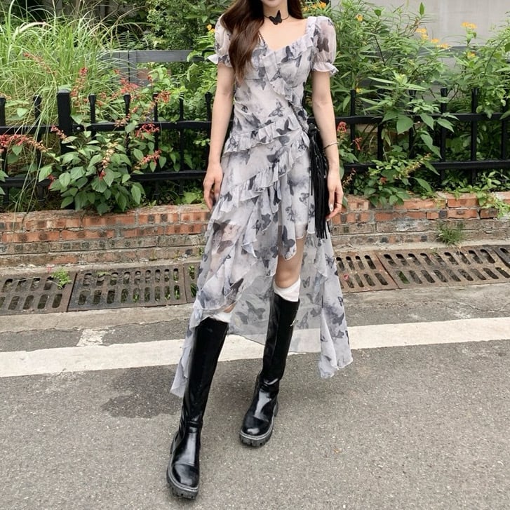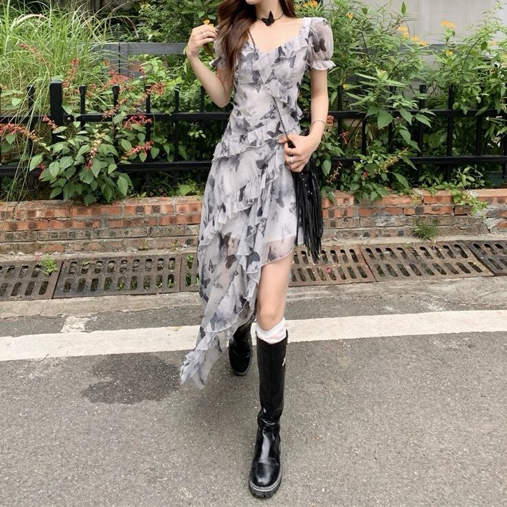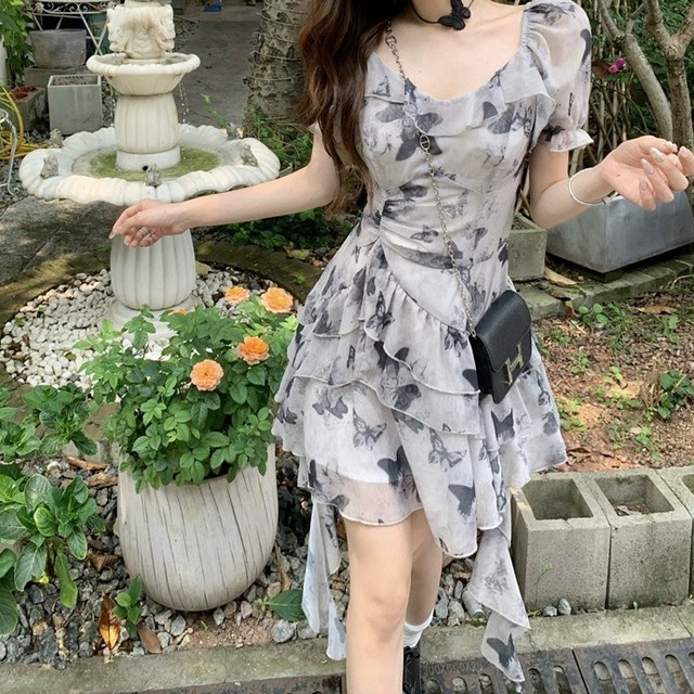 レディース スカート ワンピース ドレス フレア ティアード ミニ ロング アシンメトリー 半袖 パフスリーブ Vネック スリム Aライン フェミニン 変形 シフォン フリル 透け感 シースルー 薄手 かわいい 大人可愛い おしゃれ ガーリー 個性的 キュート ゴシック ロマンティック プリント 蝶 バタフライ 春 夏 お出かけ 休日 ショッピング ライブ モノトーン 韓国 オルチャン コーデ 体型カバー 美脚 普段使い インスタ映え M L XL 2XL 3XL 4XL 大きいサイズ ブラック グレー