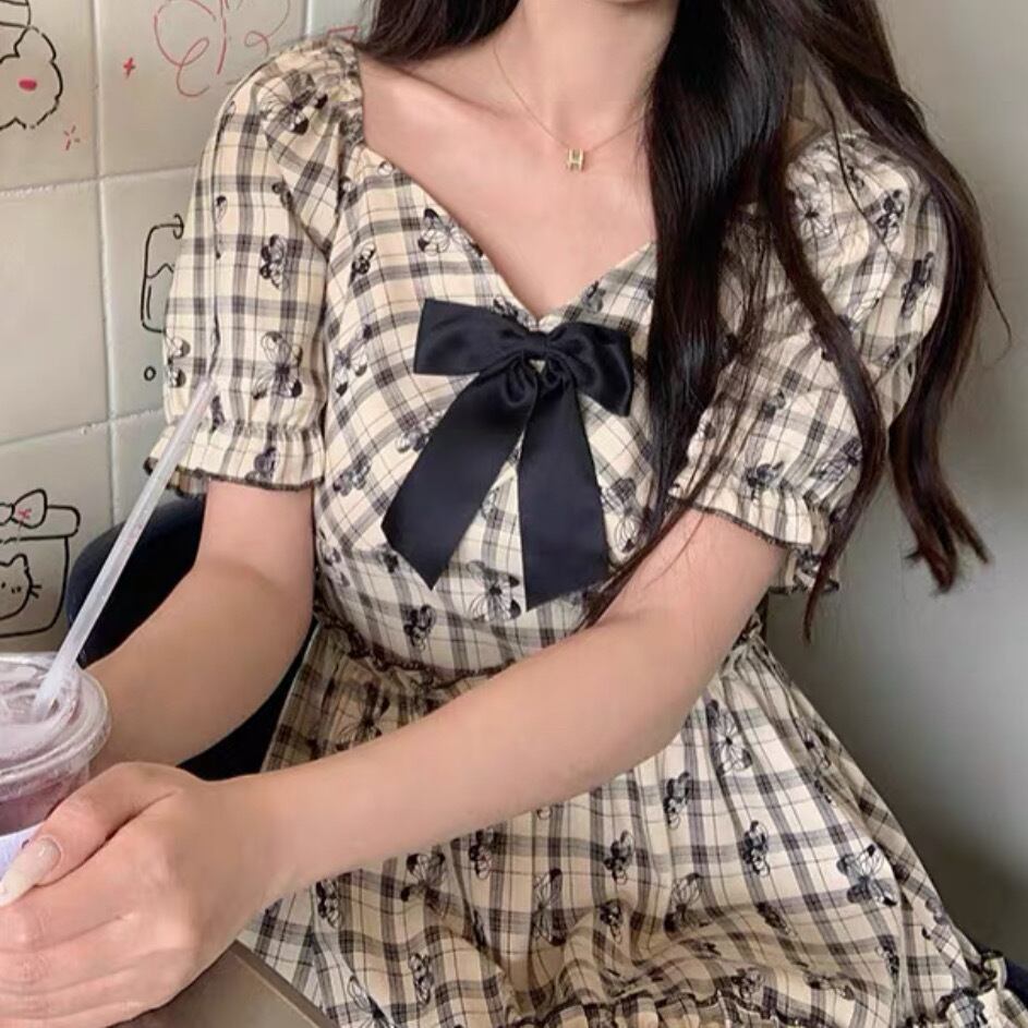 レディース スカート ワンピース ティアード ロングスカート ミモレ ロング 半袖 パフスリーブ Vネック りぼんタイ フレア スリム Aライン 切り替え フェミニン リボン ハイウエスト ヴィンテージ ギャザー かわいい カジュアル おしゃれ レトロ ラフ ガーリー ルーズ ラブリー キュート クラシカル チェック 蝶 バタフライ 春 夏 デート お出かけ 公園 女子会 ガーデン ショッピング 韓国 コーデ 楽ちん 体型カバー 普段使い L XL 2XL 3XL 4XL 大きいサイズ アプリコット 黒