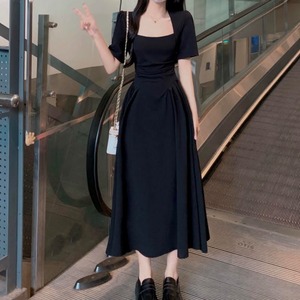 レディース ワンピース 半袖 スクエアネック ロング丈 プリーツ Aライン 無地 ウエストマーク ハイウエスト スリム 細身 きれいめ 上品 おしゃれ お洒落 大人可愛い 大人女子 かっこいい スタイリッシュ クール モダン シック フェミニン レトロ 主役級 存在感 こなれ感 抜け感 夏 20代 30代 お出かけ デート 女子会 旅行 休日 普段使い 韓国 韓国系 オルチャン ファッション コーデ トレンド スタイル 美スタイル 脚長 美脚 M L XL 2XL 3XL 4XL グリーン ブラック