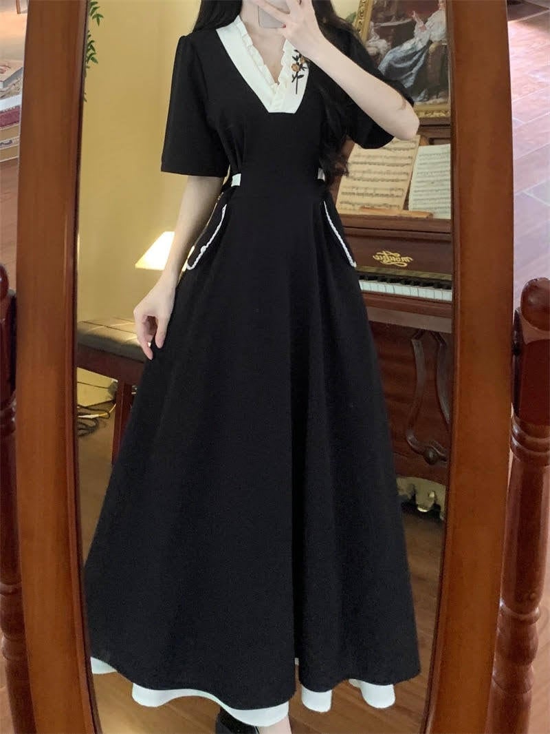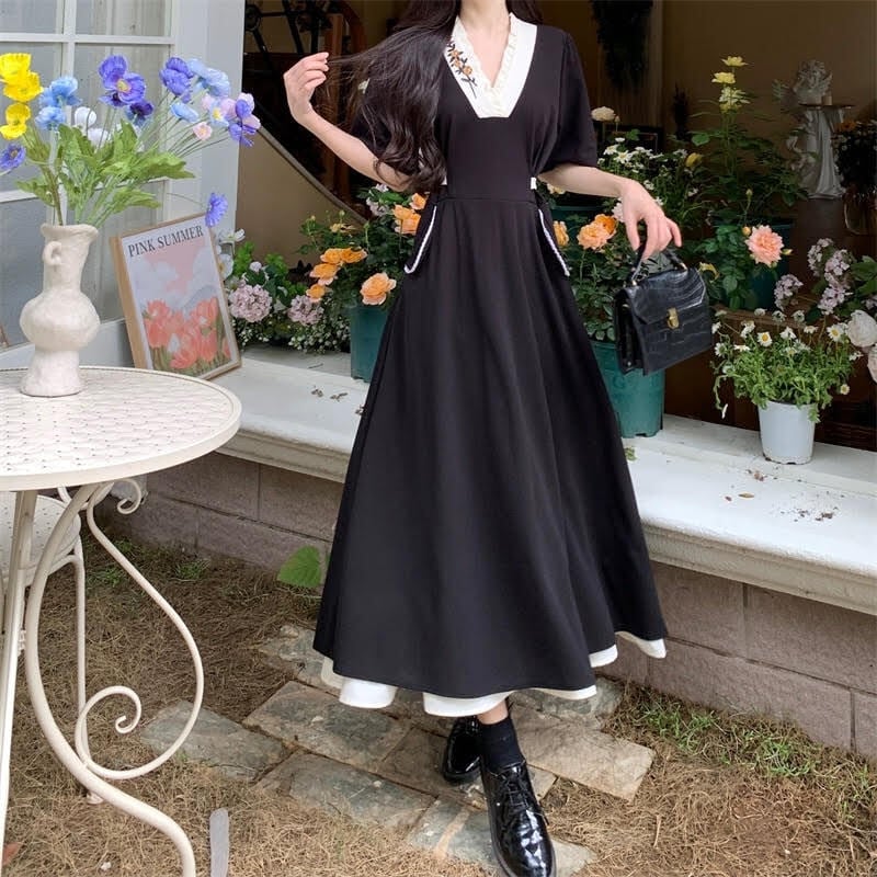 レディース ワンピース 半袖 Vネック ロング丈 Aライン 花 刺繍 ハイウエスト スリム 細身 きれいめ 上品 おしゃれ お洒落 大人可愛い 大人女子 かっこいい スタイリッシュ エレガント クール モダン シック フェミニン レトロ 主役級 存在感 こなれ感 抜け感 夏 20代 30代 お出かけ デート 女子会 ショッピング レストラン ガーデン 旅行 休日 普段使い 韓国 韓国系 オルチャン ファッション コーデ トレンド 美スタイル 脚長 美脚 M L XL 2XL 3XL 4XL 黒 ブラック