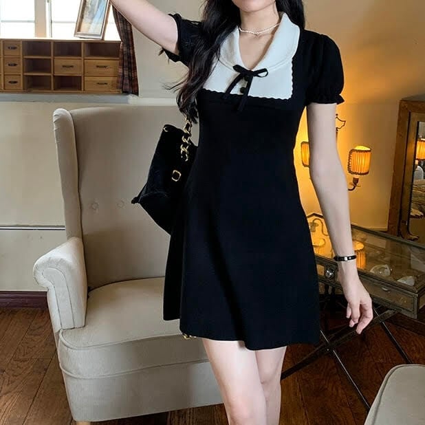 レディース ワンピース 半袖 襟付き ドールカラー ショート丈 Aライン リボン ハイウエスト スリム 細身 きれいめ 上品 おしゃれ お洒落 大人可愛い 大人女子 シンプル かっこいい スタイリッシュ エレガント キュート ラブリー ガーリー フェミニン レトロ 主役級 存在感 こなれ感 抜け感 夏 10代 20代 お出かけ デート 女子会 ショッピング レストラン ガーデン 旅行 休日 普段使い 韓国系 オルチャン ファッション コーデ トレンド 美スタイル 脚長 美脚 XS S M L ブラック