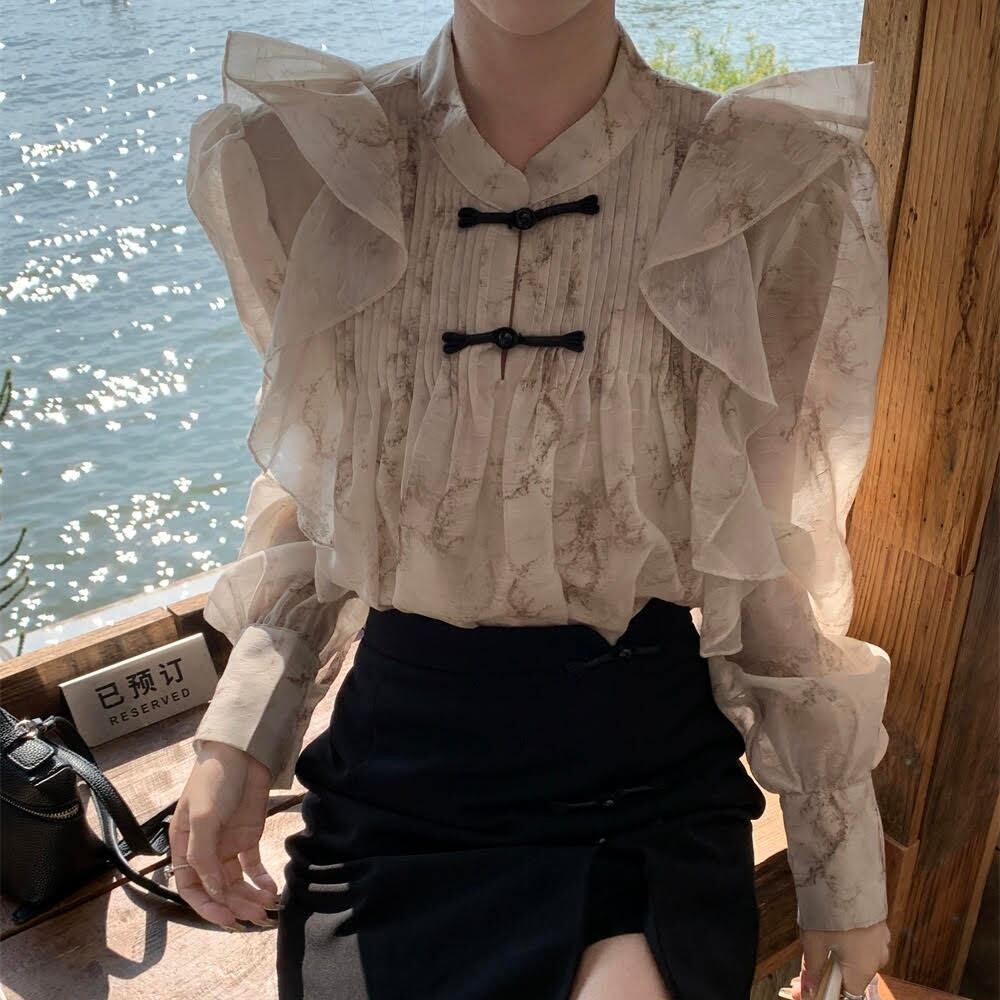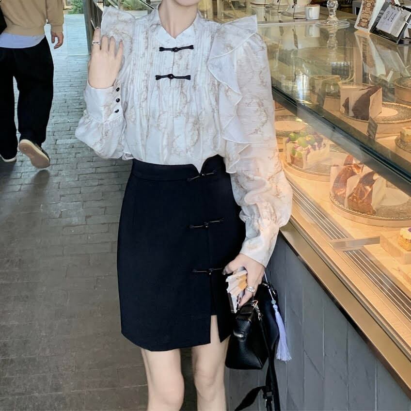 レディース セットアップ シャツ 長袖 フリル シフォン スカート ショート丈 Aライン スリット スリム 細身 2点セット 上下セット きれいめ 上品 おしゃれ お洒落 大人可愛い 大人女子 かっこいい スタイリッシュ エレガント キュート ラブリー ガーリー レトロ 主役級 存在感 こなれ感 抜け感 春 10代 20代 30代 お出かけ デート 女子会 旅行 休日 普段使い デイリー 韓国 韓国系 オルチャン ファッション コーデ トレンド 脚長 美脚 インスタ映え S M L アプリコット ブラック