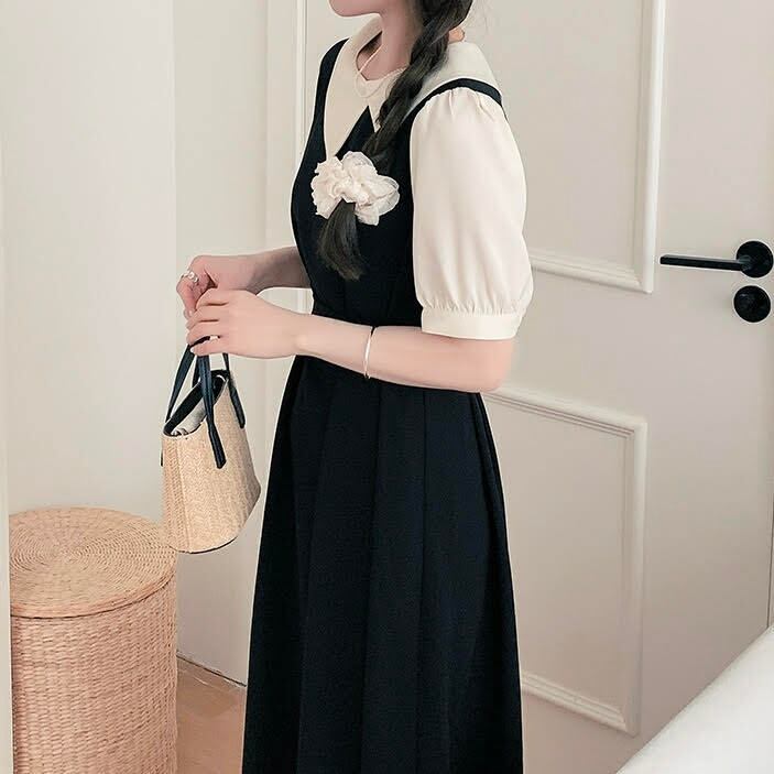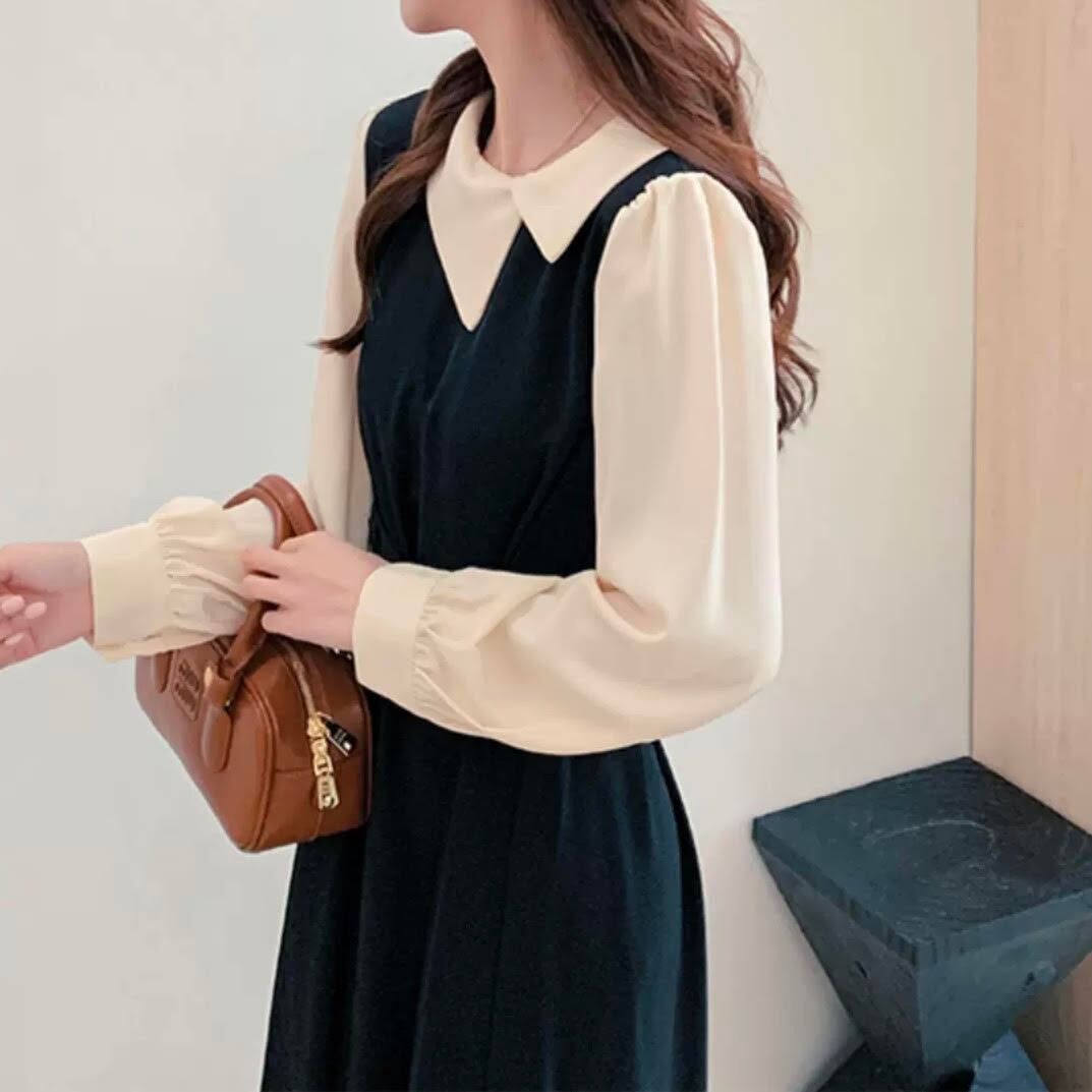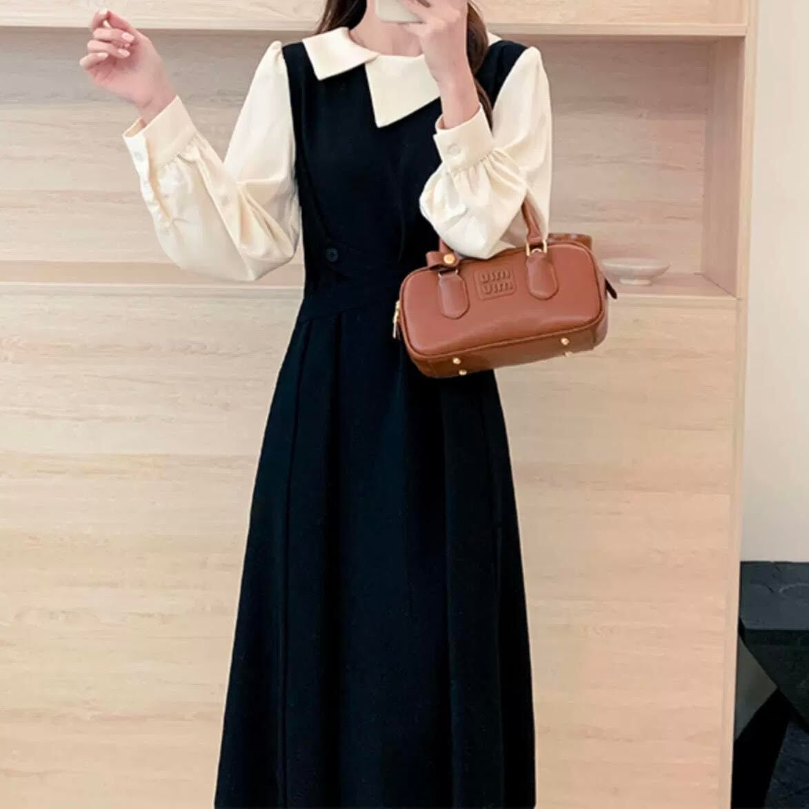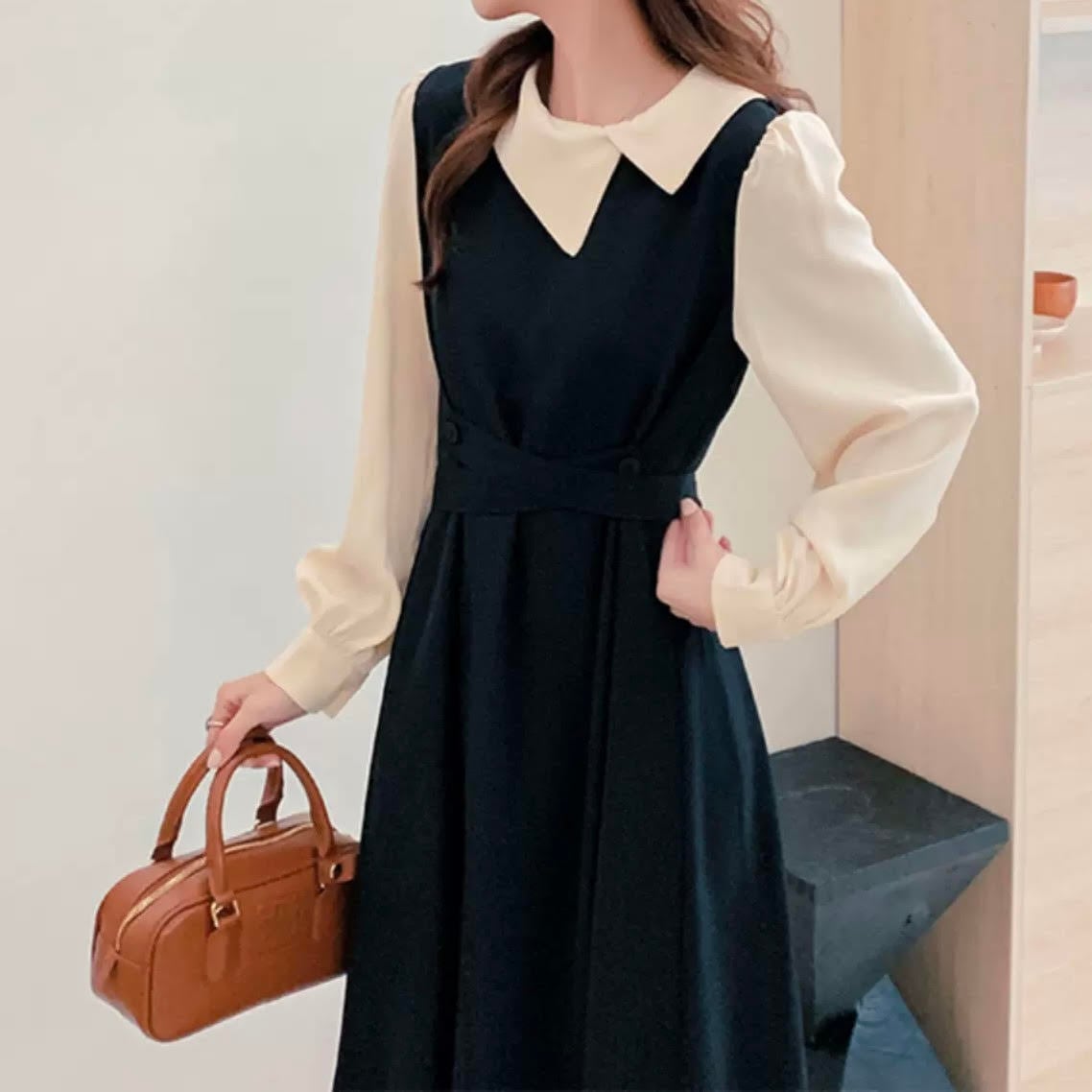 レディース ワンピース 半袖 長袖 ミモレ丈 Aライン フェイクツーピース ウエストマーク スリム 細身 きれいめ 上品 おしゃれ お洒落 シンプル 大人可愛い 大人女子 かっこいい スタイリッシュ エレガント キュート クール モダン シック レトロ 主役級 存在感 こなれ感 抜け感 春 秋 20代 30代 OL 通勤 お出かけ デート 女子会 お泊まり 旅行 休日 普段使い デイリー 韓国 韓国系 オルチャン ファッション コーデ トレンド 脚長 美脚 S M L XL 2XL 3XL ブラック