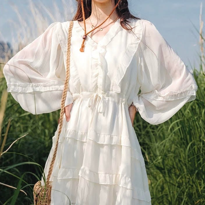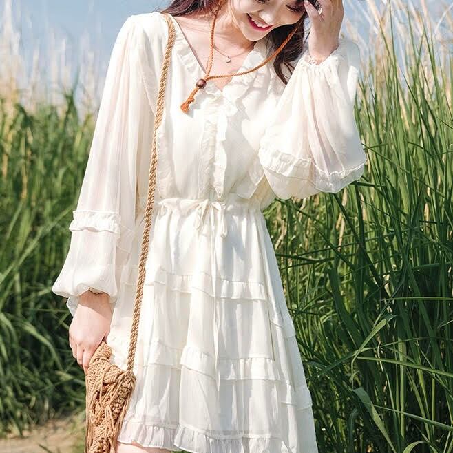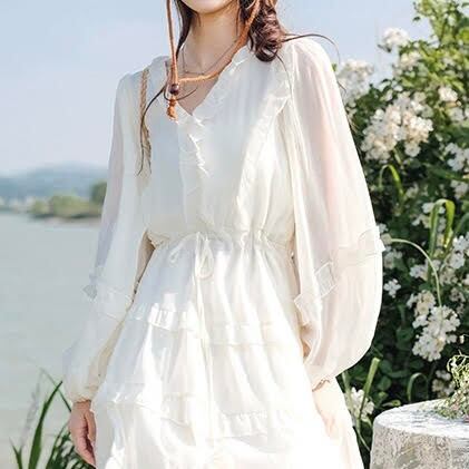 レディース ワンピース 長袖 膝丈 Aライン Vネック フリル ウエストマーク ウエストリボン ルーズ きれいめ 上品 おしゃれ お洒落 シンプル 大人可愛い 大人女子 かっこいい スタイリッシュ エレガント キュート ラブリー ガーリー レトロ 主役級 存在感 こなれ感 抜け感 春 10代 20代 お出かけ デート 女子会 お泊まり 旅行 休日 ショッピング レストラン 普段使い デイリー 韓国 韓国系 オルチャン ファッション コーデ トレンド 脚長 美脚 インスタ映え 楽チン S M L ホワイト