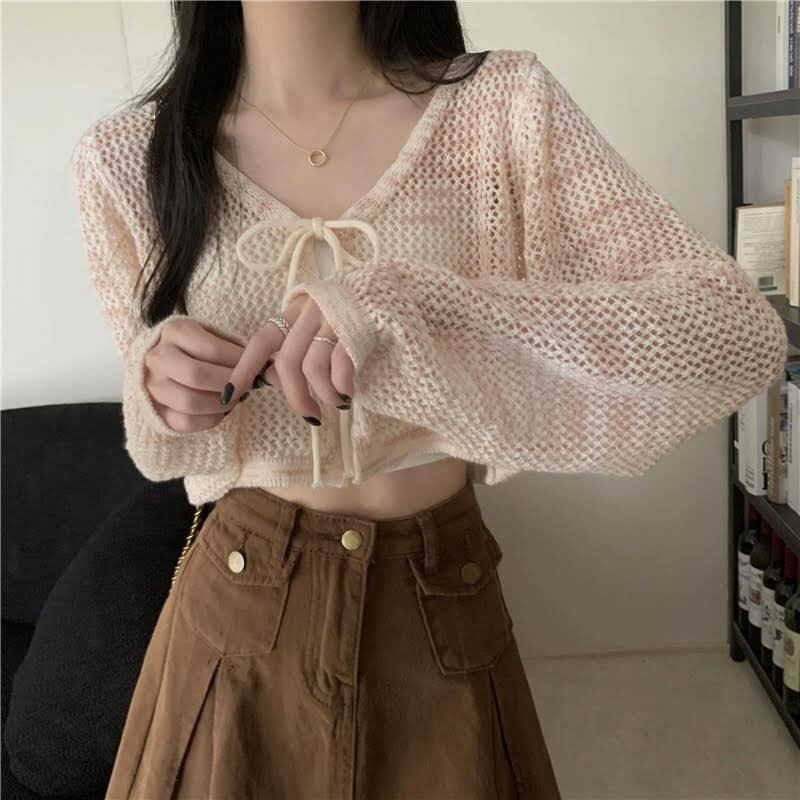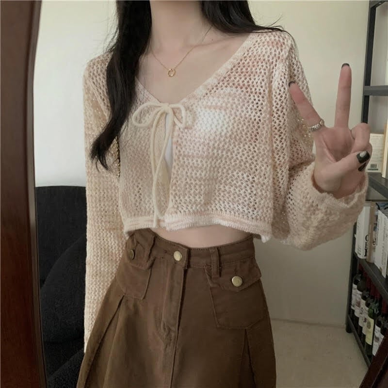 レディース トップス カーディガン ニットカーディガン 長袖 Vネック ショート丈 透け感 薄手 リボン 前開き スリム 細身 きれいめ 上品 おしゃれ お洒落 シンプル 大人可愛い 大人女子 かっこいい スタイリッシュ エレガント キュート フェミニン レトロ 主役級 存在感 こなれ感 抜け感 春 夏 10代 20代 30代 お出かけ デート 女子会 お泊まり 休日 ショッピング 普段使い デイリー 韓国 オルチャン ファッション コーデ トレンド ワンサイズ ホワイト アプリコット ブルー ピンク