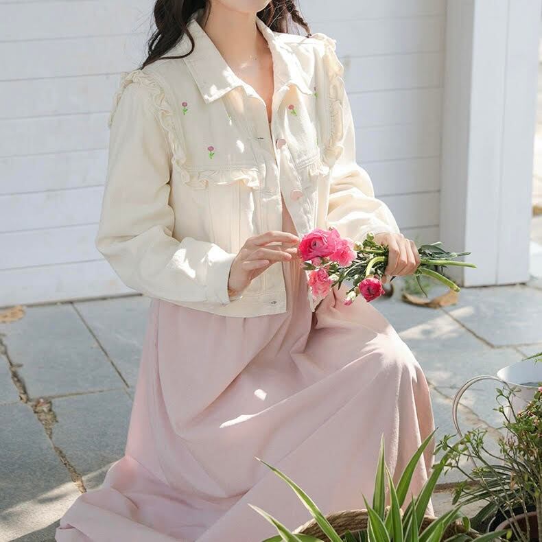 レディース ジャケット デニムジャケット アウター 長袖 襟付き ショート丈 ボタン 前開き 花 フリル スリム 細身 きれいめ 上品 おしゃれ お洒落 シンプル カジュアル 大人可愛い 大人女子 かっこいい スタイリッシュ キュート ラブリー ガーリー フェミニン レトロ 主役級 存在感 こなれ感 抜け感 春 夏 10代 20代 お出かけ デート 女子会 お泊まり 休日 ショッピング 普段使い デイリー 韓国系 オルチャン ファッション コーデ トレンド インスタ映え スタイル S M L ホワイト