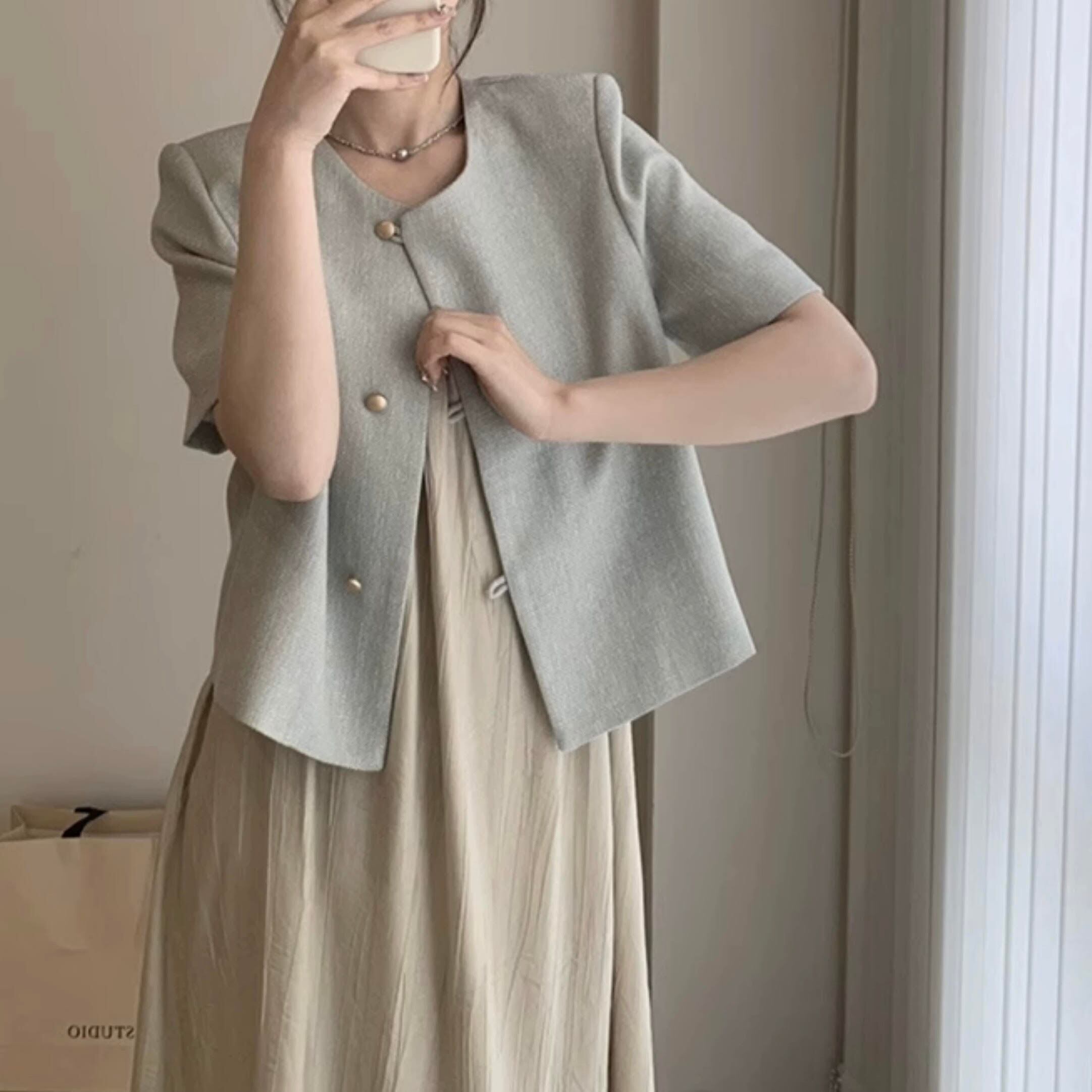 レディース セットアップ ジャケット アウター 半袖 ラウンドネック ショート丈 ボタン 前開き ワンピース ノースリーブ サスペンダー ロング丈 Aライン スリム 細身 きれいめ 上品 お洒落 シンプル カジュアル 大人可愛い 大人女子 かっこいい スタイリッシュ クール フェミニン レトロ 主役級 存在感 こなれ感 抜け感 夏 20代 30代 お出かけ デート 女子会 休日 普段使い 韓国 オルチャン ファッション コーデ トレンド S M L XL 2XL グレーグリーン アプリコットホワイト