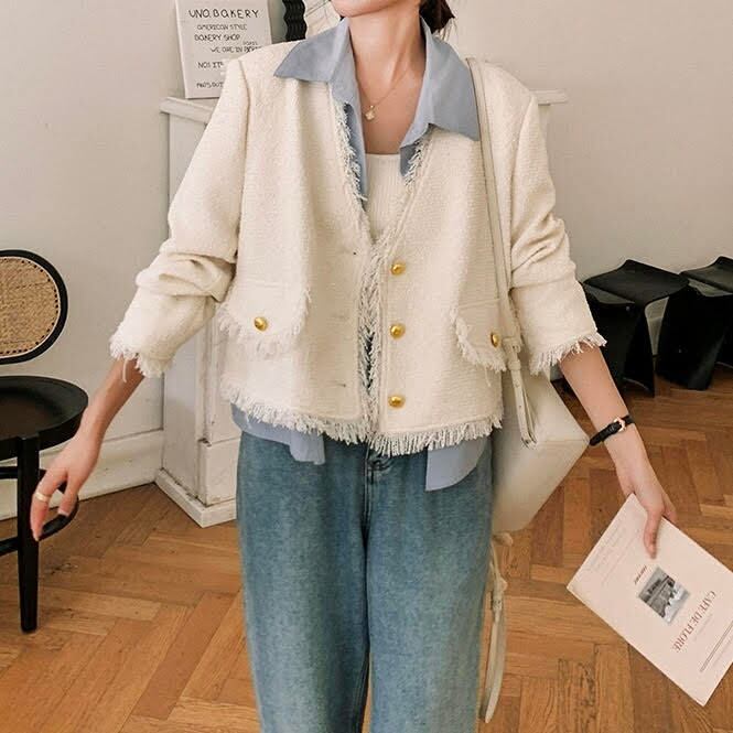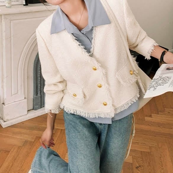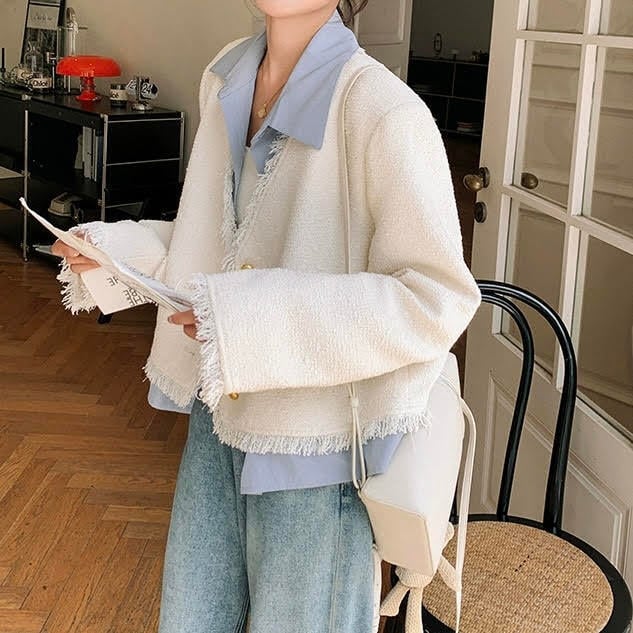 レディース ジャケット アウター 長袖 Vネック 襟付き ポロカラー タッセル ボタン 前開き ポケット 無地 スリム 細身 きれいめ 上品 おしゃれ お洒落 シンプル カジュアル 大人可愛い 大人女子 かっこいい スタイリッシュ クール モダン シック フェミニン レトロ 主役級 存在感 こなれ感 抜け感 春 秋 10代 20代 30代 お出かけ デート 女子会 お泊まり 旅行 休日 ショッピング 普段使い デイリー 韓国 オルチャン ファッション コーデ トレンド スタイル S M L XL ホワイト