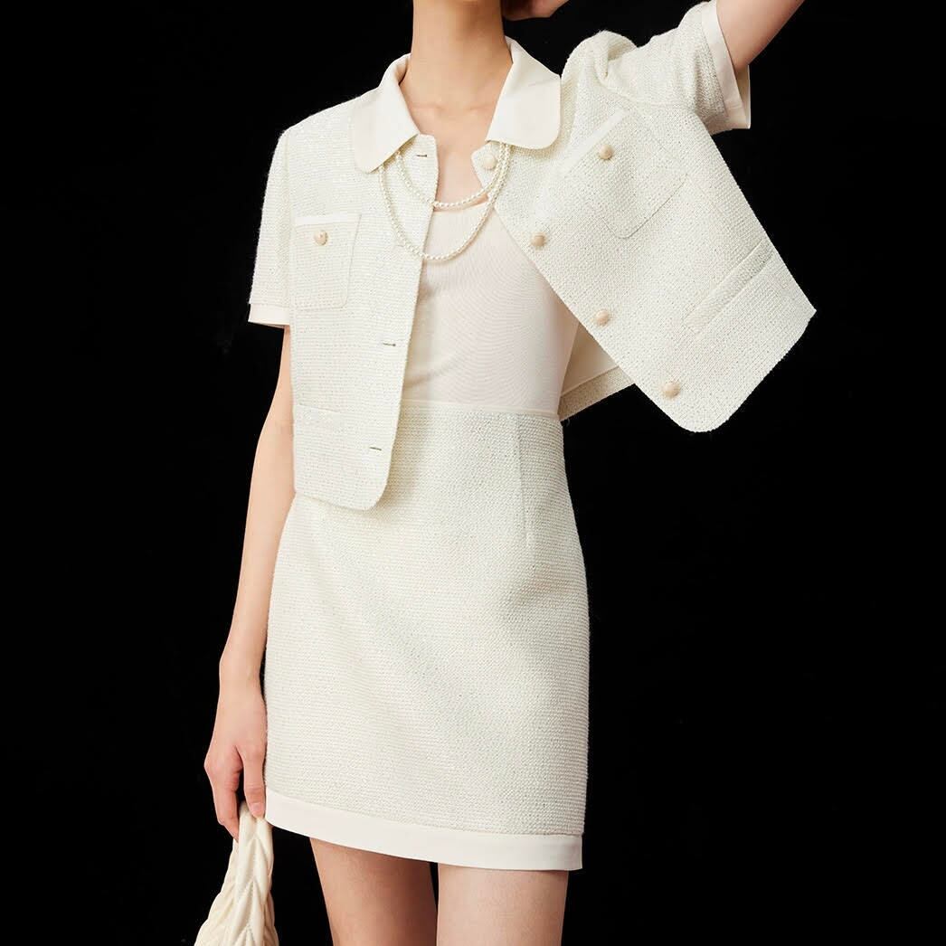 レディース セットアップ ジャケット 半袖 襟付き ボタン 前開き ポケット スカート ショート丈 ワンピース ノースリーブ 3点セット 上下セット スリム 細身 きれいめ 上品 おしゃれ お洒落 大人可愛い 大人女子 かっこいい スタイリッシュ エレガント クール モダン シック フェミニン レトロ 主役級 存在感 こなれ感 抜け感 夏 20代 30代 OL 通勤 お呼ばれ お出かけ デート 女子会 お泊まり 韓国 オルチャン 着回し ファッション コーデ トレンド スタイル XS S M ホワイト