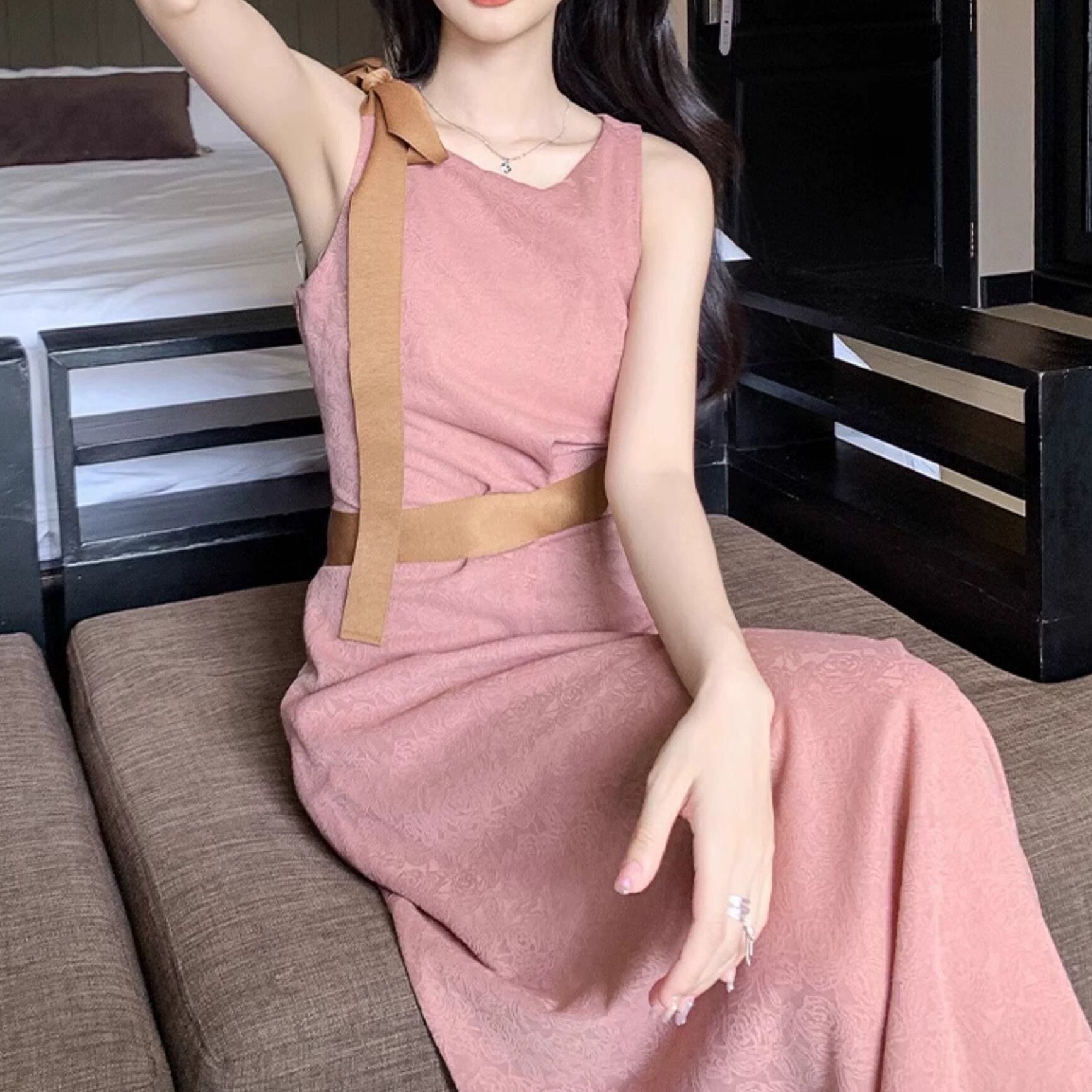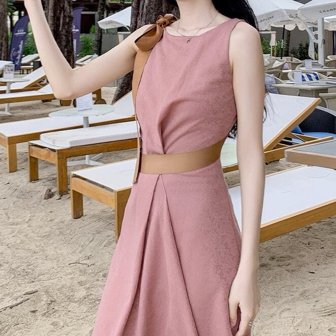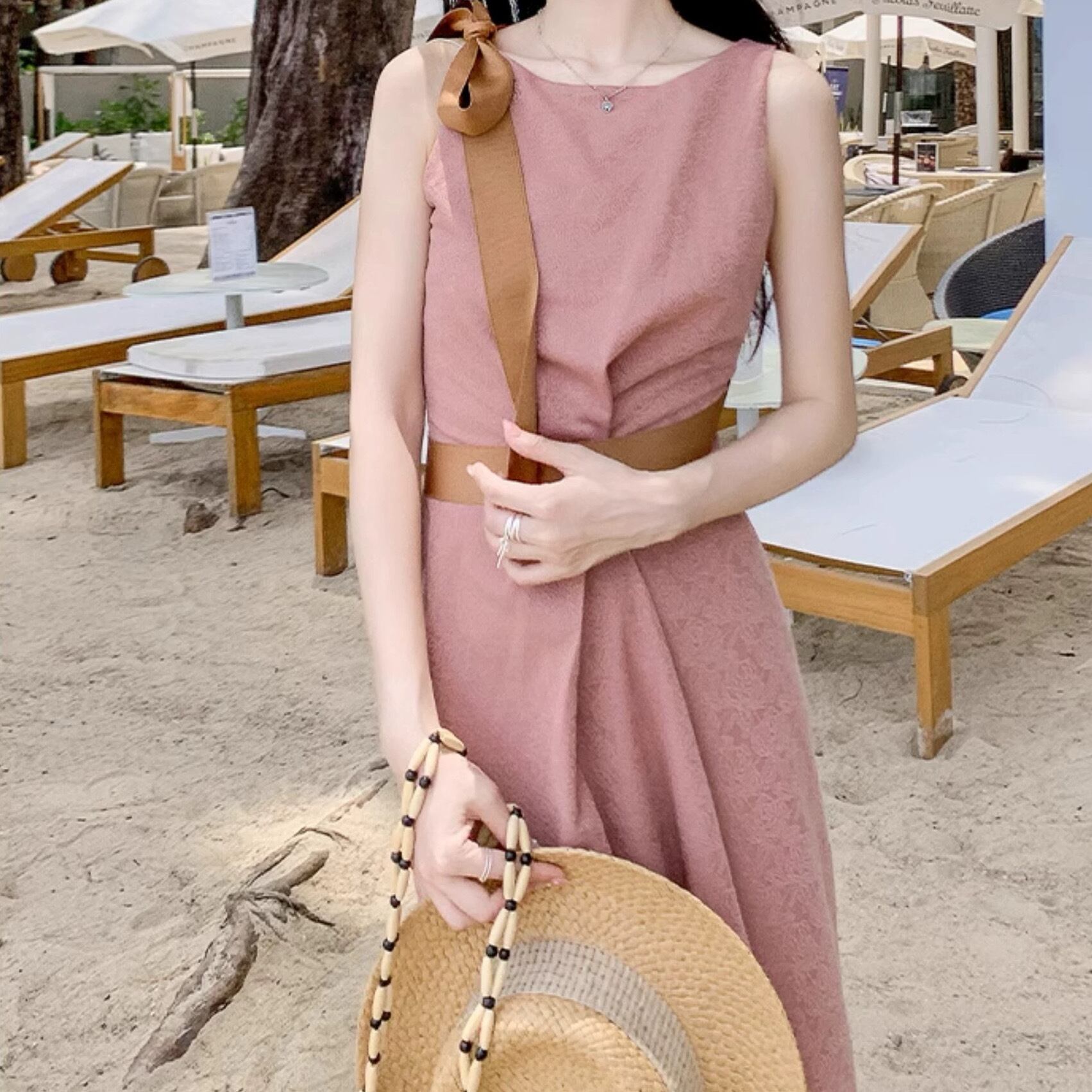 レディース スカート ワンピース ドレス ロングスカート ロング 袖なし ノースリーブ ラウンドネック セミフレア スリム 細身 Aライン ドレープ フェミニン タック リボン ウエストマーク ハイウエスト 落ち感 大人可愛い きれいめ 上品 おしゃれ ガーリー エレガント キュート ラグジュアリー ロマンティック 花柄 フラワー 総柄 ローズ バラ 春 夏 誕生日 二次会 披露宴 デート パーティー レストラン 発表会 コンサート 韓国 オルチャン コーデ 美脚 脚長 モテ サイズ S M L ピンク