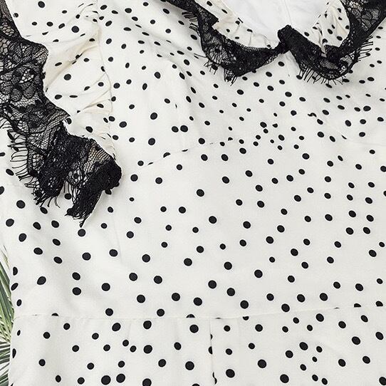ホワイト地にブラックレースとリボンが可愛らしさを引き立て、スカートのに施されたサイドフリルが女性らしい印象を演出してくれます。