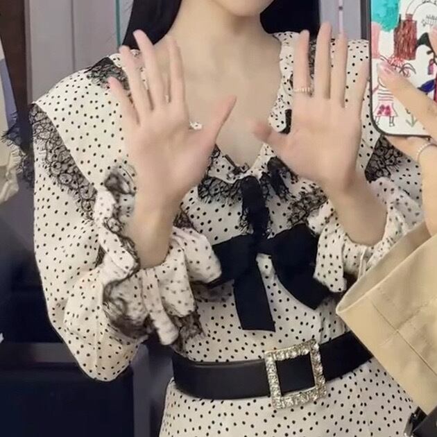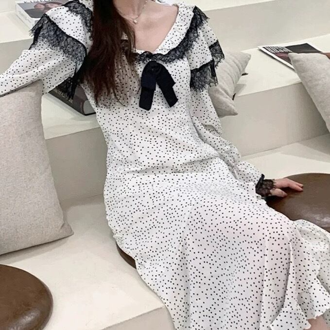 レディース スカート ワンピース ロングスカート ロング 長袖 フレアスリーブ ベルスリーブ Vネック セミフレア スリム 細身 フェミニン レース フリル リボン ハイウエスト かわいい 大人可愛い おしゃれ レトロ ガーリー ヴィンテージ ラブリー クラシカル ロマンティック フレンチ ドット柄 水玉 秋 冬 二次会 デート お出かけ パーティー レストラン 女子会 ホテル ガーデン ショッピング モノトーン 韓国 オルチャン コーデ スタイル 美脚 脚長 サイズ展開 S M L XL 白 ホワイト