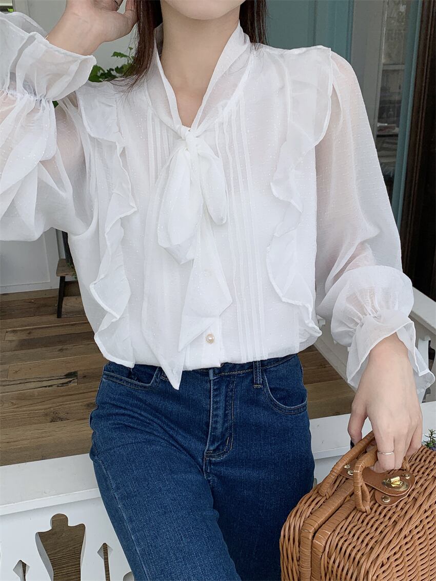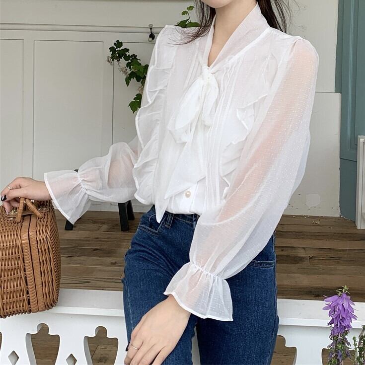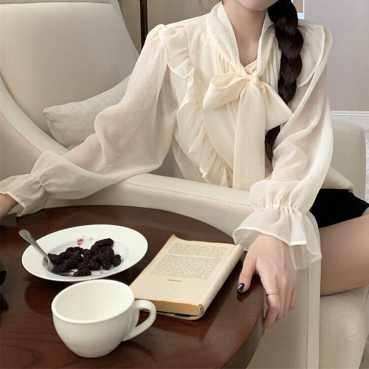 レディース トップス ブラウス 長袖 シフォン フリル リボン 大人可愛い きれいめ シンプル おしゃれ かっこいい ラフ ガーリー クール 都会的 ナチュラル 無地 春 秋 通勤 デート お出かけ お泊まり イベント 旅行 レストラン 公園 女子会 休日 ホテル ショッピング コンサート ライブ カフェ 韓国 コーデ 楽ちん プレゼント 普段使い 着回し モテ インスタ映え フリーサイズ ホワイト アプリコット