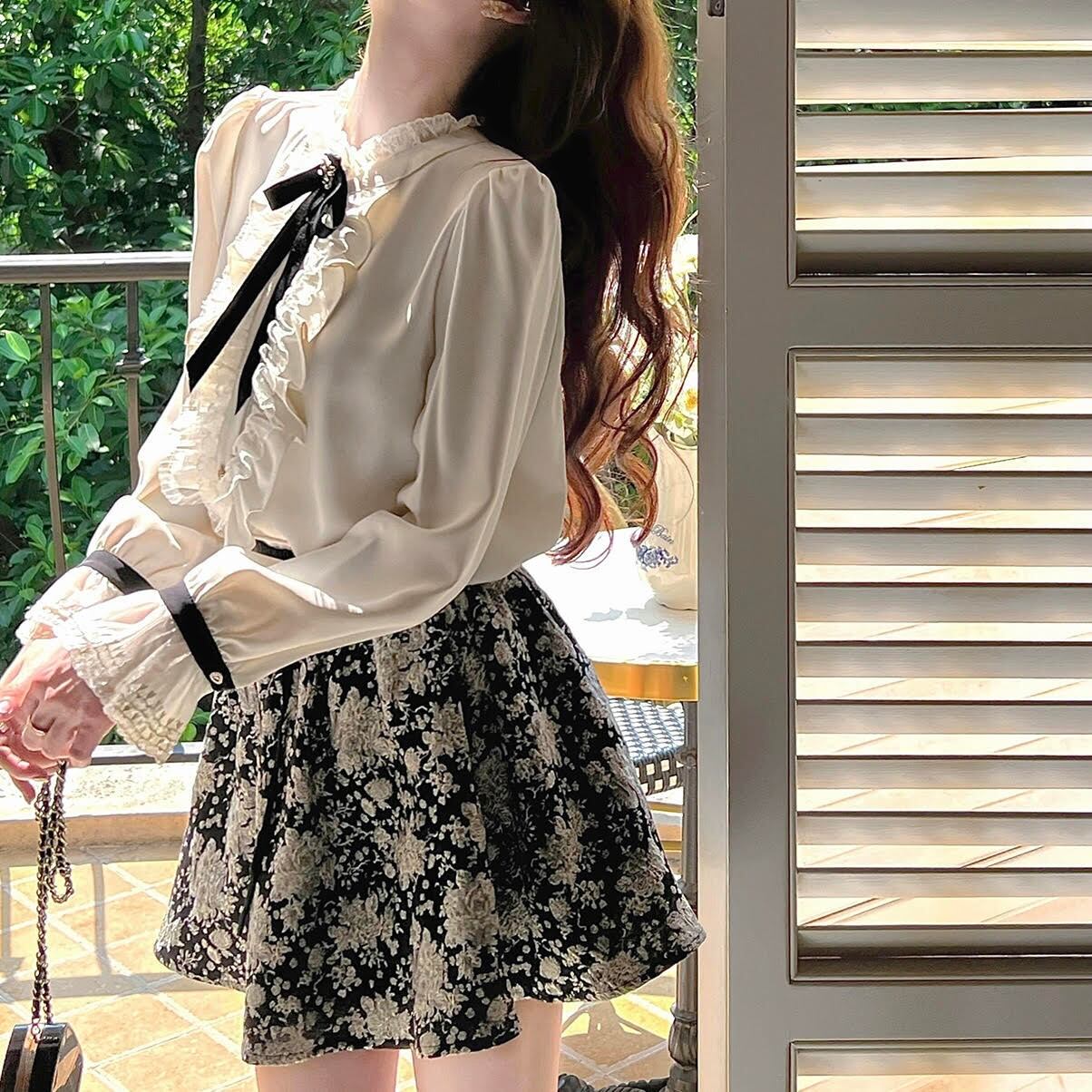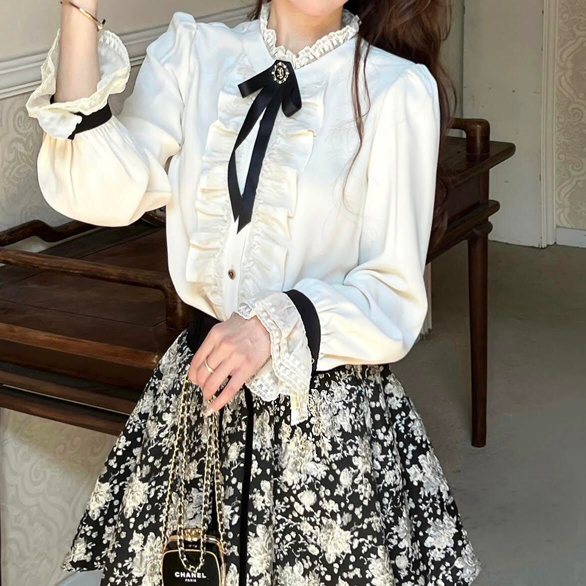 レディース トップス シャツ 長袖 スタンドカラー フリル リボン ボタン 前開き スリム 細身 きれいめ 上品 おしゃれ お洒落 大人可愛い 大人女子 カジュアル かっこいい スタイリッシュ エレガント キュート ラブリー ガーリー フェミニン レトロ 主役級 存在感 こなれ感 抜け感 春 10代 20代 お呼ばれ お出かけ デート 女子会 お泊まり ショッピング レストラン 休日 普段使い デイリー 韓国 韓国系 オルチャン ファッション コーデ スタイルアップ インスタ映え S M L ホワイト