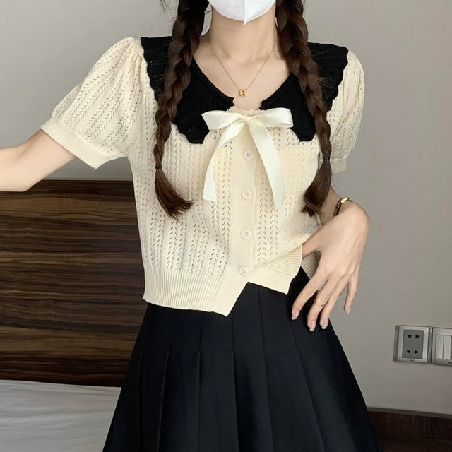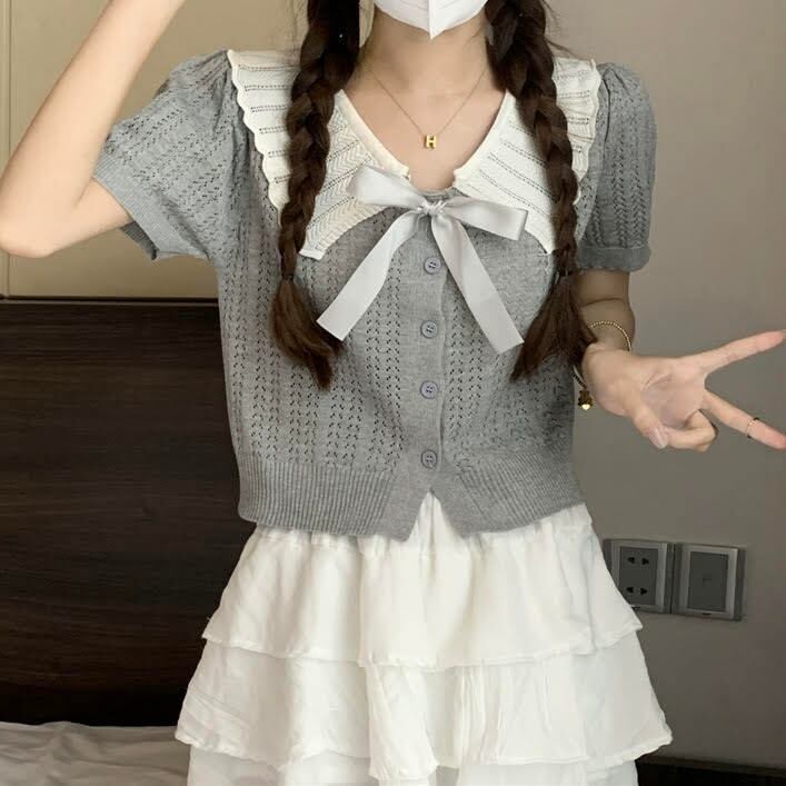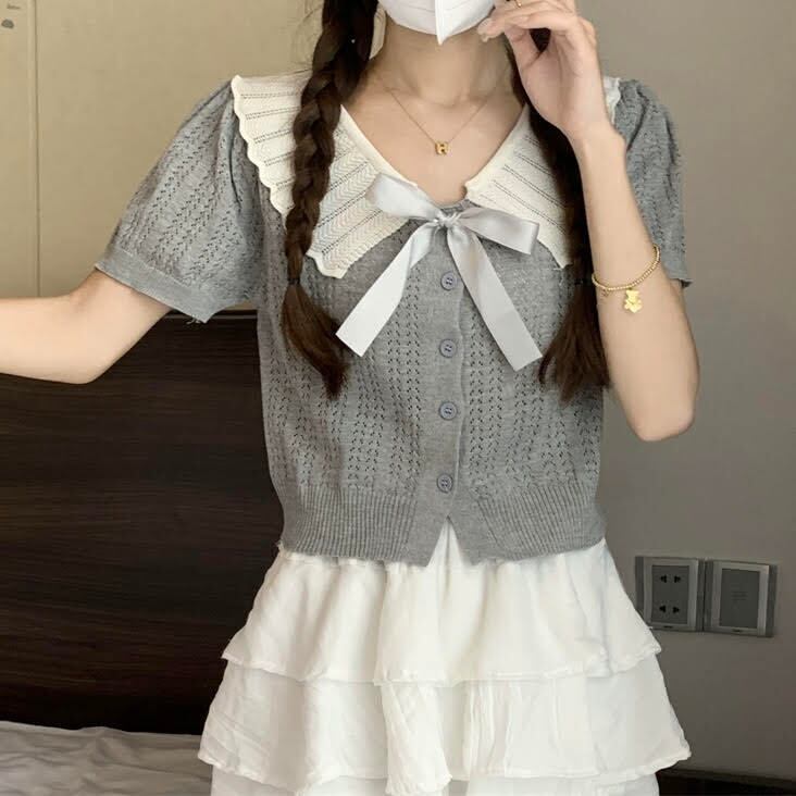 レディース トップス カーディガン 半袖 襟付き ドールカラー ショート丈 リボン ボタン 前開き スリム 細身 きれいめ 上品 おしゃれ お洒落 大人可愛い 大人女子 カジュアル かっこいい キュート ラブリー ガーリー フェミニン レトロ 主役級 存在感 こなれ感 抜け感 夏 10代 20代 お出かけ デート 女子会 お泊まり 旅行 ショッピング レストラン ガーデン 休日 普段使い デイリー 韓国 韓国系 オルチャン ファッション コーデ スタイル インスタ映え ワンサイズ グレー アプリコット