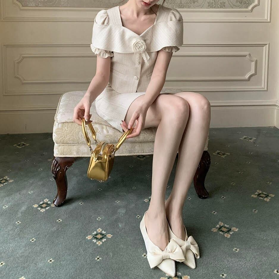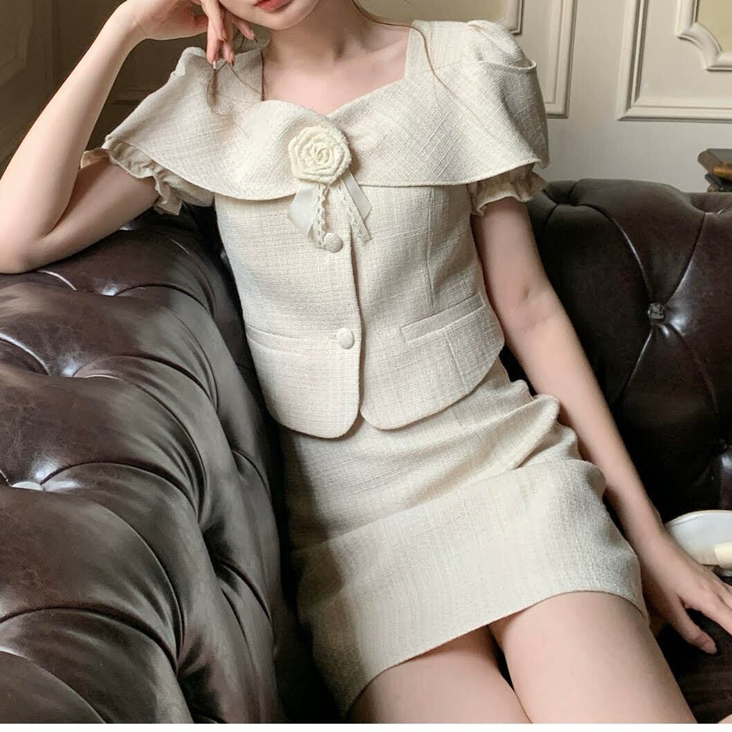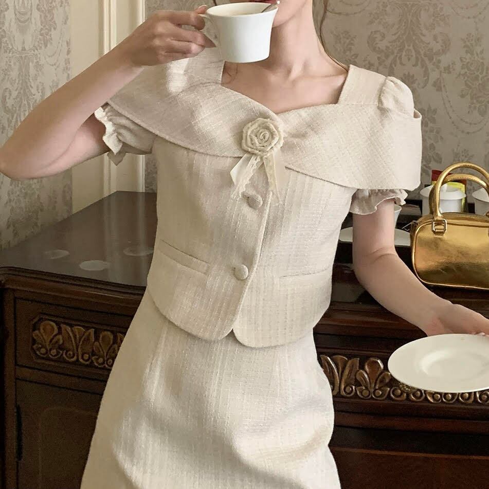 レディース トップス 半袖 パフスリーブ スクエアカラー リボン ボタン 前開き スカート ショート丈 Aライン ハイウエスト 2点セット 上下セット スリム 細身 きれいめ 上品 おしゃれ お洒落 大人可愛い 大人女子 カジュアル かっこいい クール モダン シック フェミニン レトロ 主役級 存在感 こなれ感 抜け感 春 20代 30代 お呼ばれ お出かけ デート 女子会 ショッピング レストラン 韓国 オルチャン ファッション コーデ スタイルアップ インスタ映え XS S M L アプリコット