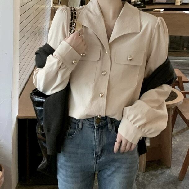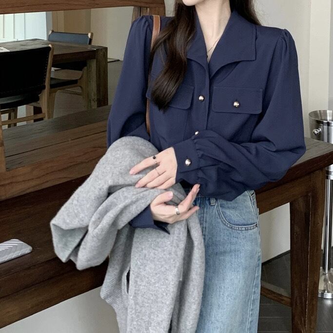 レディース トップス シャツ 羽織 前開き 長袖 パフスリーブ プリーツパフ Vネック 襟付き スリム ストレート スマート フェミニン ポケット コンサバ ボタン タックイン 裾イン 薄手 大人可愛い きれいめ シンプル カジュアル 上品 おしゃれ こなれ感 ガーリー エレガント 抜け感 クラシカル ロマンティック 無地 春 秋 入学式 入園式 卒業式 卒園式 ママ オフィス OL 通勤 デート お出かけ ショッピング 韓国 オルチャン コーデ 普段使い 着回し フリーサイズ アプリコット ネイビー