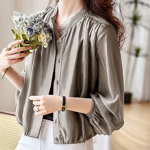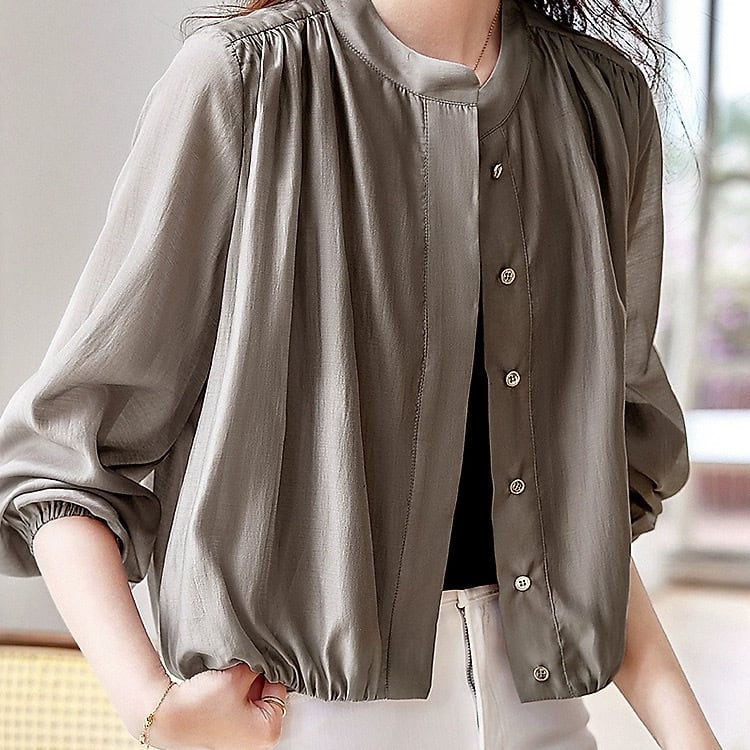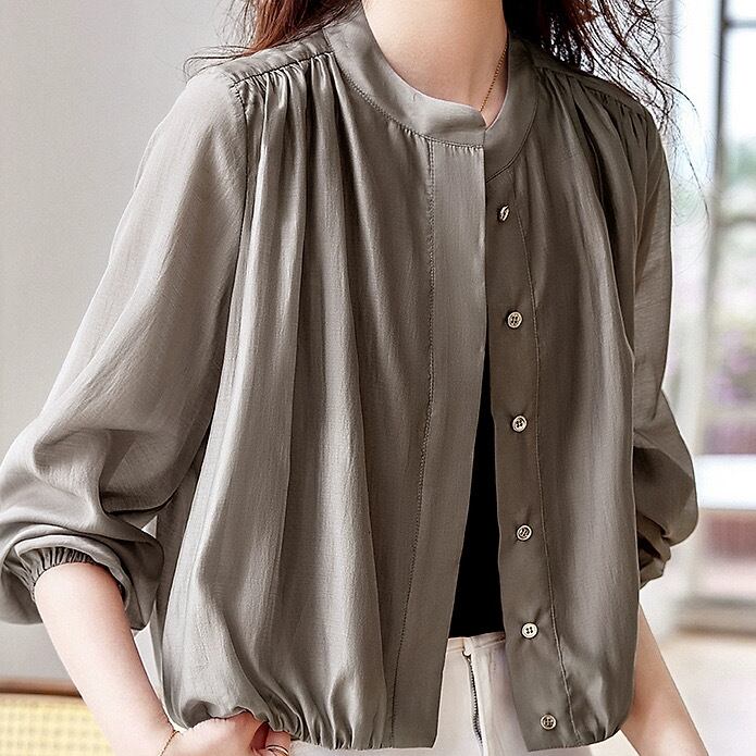 レディース トップス ジャケット カーディガン ブルゾン 上着 羽織 前開き 長袖 ラウンドネック バンドカラー ドレープ フェミニン コンサバ ボタン ギャザー 薄手 きれいめ シンプル カジュアル 上品 おしゃれ こなれ感 ラフ ルーズ エレガント 無地 春 夏 秋 母の日 ママ デート お出かけ アウトドア 公園 女子会 休日 ガーデン ショッピング 韓国 コーデ スタイル 普段使い 着回し 紫外線対策 日焼け対策 サイズ S M L XL 2XL 大きいサイズ ゆる グレー カーキ アースカラー