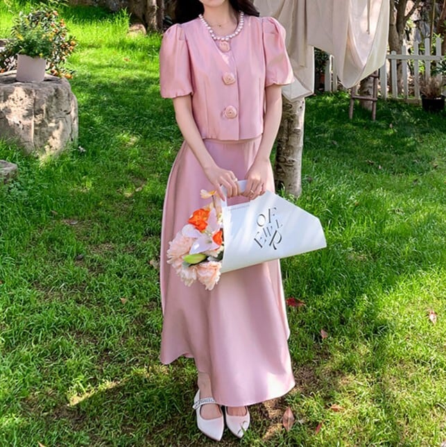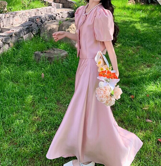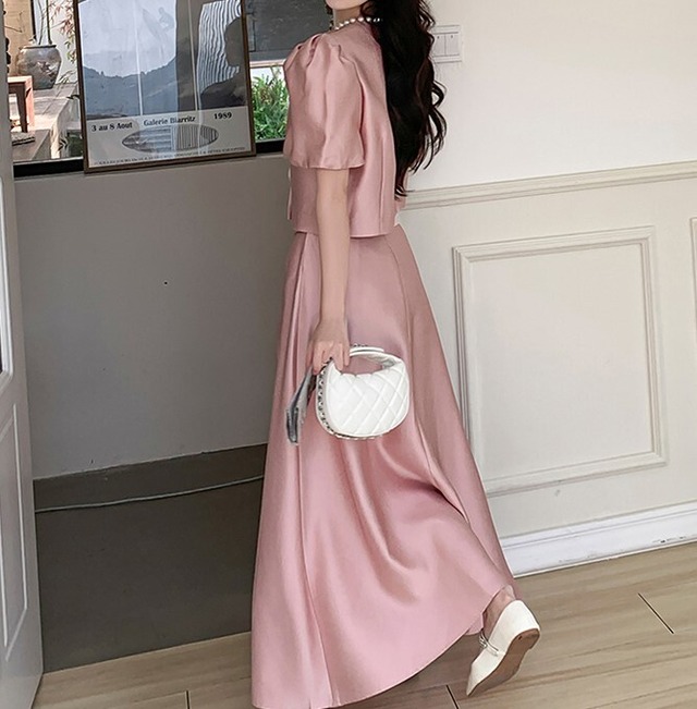 レディース スカート ジャケット セットアップ ドレス ロング 半袖 パフスリーブ ラウンドネック Aライン ハイウエスト ボタン 大人可愛い きれいめ 上品 おしゃれ かっこいい ラフ ガーリー クール エレガント 主役級 存在感 フォーマル 都会的 ロマンティック 無地 春 夏 結婚式 二次会 披露宴 発表会 デート お出かけ パーティー イベント レストラン 女子会 休日 ホテル お揃い 韓国 コーデ 楽ちん プレゼント 美脚 脚長 モテ インスタ映え S M L XL 2XL 大きいサイズ ピンク