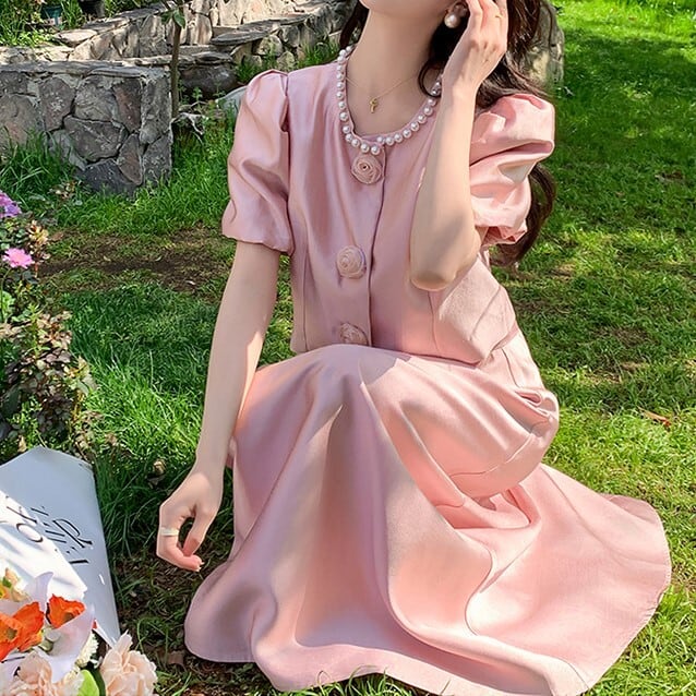 お探しの大人可愛いセットアップドレスがこちら!華やかなイベントやパーティーにぴったりな、上品な存在感を放つアイテムです。ハイウエストのAラインシルエットが美しい、主役級の存在感を演出します。ラウンドネックとパフスリーブで、女性らしさを引き立てるデザインが魅力。贅沢に施された大人可愛いボタンもポイントです。