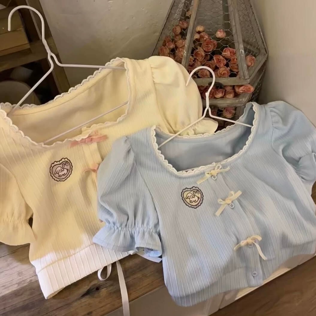 レディース トップス カットソー 半袖 スクエアカラー リボン レース ボタン 前開き ショート丈 スリム 細身 きれいめ 上品 おしゃれ お洒落 大人可愛い 大人女子 シンプル カジュアル かっこいい キュート ラブリー ガーリー フェミニン レトロ 主役級 存在感 こなれ感 抜け感 夏 10代 20代 お出かけ デート 女子会 お泊まり 旅行 ショッピング レストラン 休日 普段使い デイリー 韓国 韓国系 オルチャン ファッション コーデ スタイルアップ インスタ映え XS S M イエロー ブルー
