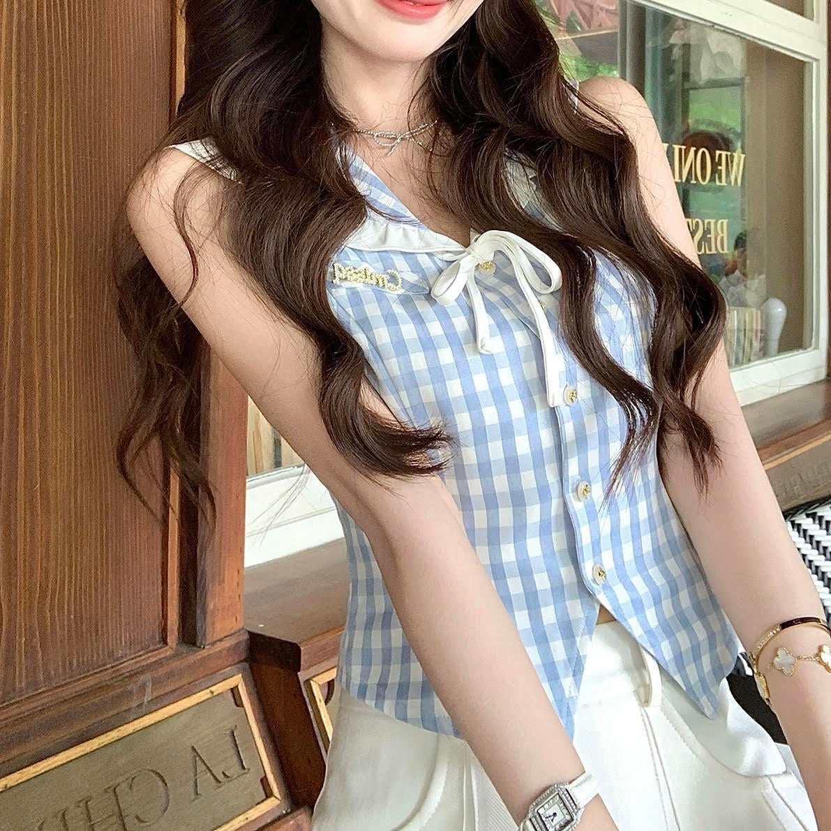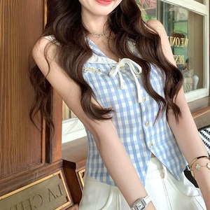 レディース トップス シャツ ノースリーブ 襟付き Vネック フリル リボン チェック柄 ボタン 前開き スリム 細身 きれいめ 上品 おしゃれ お洒落 大人可愛い 大人女子 シンプル カジュアル かっこいい キュート ラブリー ガーリー フェミニン レトロ 主役級 存在感 こなれ感 抜け感 夏 10代 20代 お出かけ デート 女子会 お泊まり 旅行 ショッピング レストラン 休日 普段使い デイリー 韓国 韓国系 オルチャン ファッション コーデ スタイルアップ インスタ映え XS S M L ブルー