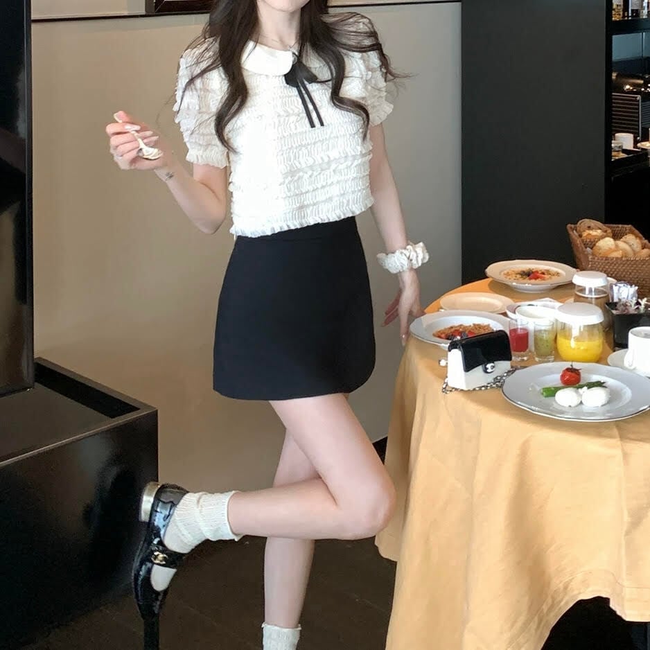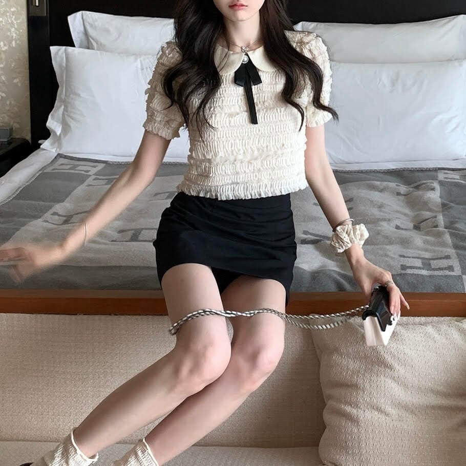 レディース トップス カットソー 半袖 パフスリーブ 襟付き ドールカラー リボン プルオーバー ショート丈 スリム 細身 きれいめ 上品 おしゃれ お洒落 大人可愛い 大人女子 シンプル カジュアル かっこいい キュート ラブリー ガーリー フェミニン レトロ 主役級 存在感 こなれ感 抜け感 夏 10代 20代 お出かけ デート 女子会 お泊まり 旅行 ショッピング レストラン 休日 普段使い デイリー 韓国 韓国系 オルチャン ファッション コーデ スタイル インスタ映え S M L アプリコット