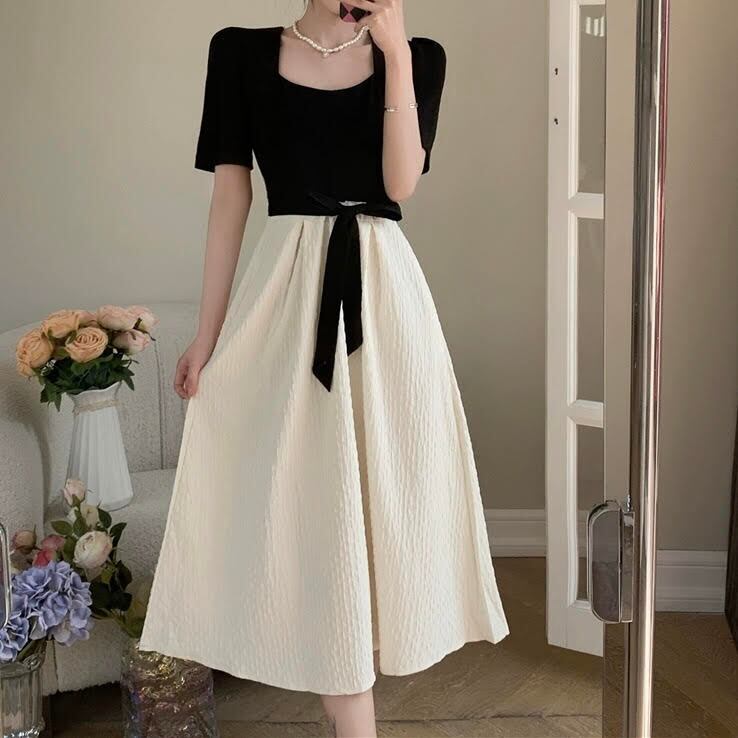 レディース ワンピース 半袖 スクエアカラー ウエストリボン Aライン 無地 ミモレ丈 ハイウエスト スリム 細身 きれいめ 上品 おしゃれ お洒落 大人可愛い 大人女子 シンプル カジュアル かっこいい エレガント クール モダン シック フェミニン レトロ 主役級 存在感 こなれ感 抜け感 夏 20代 30代 40代 お出かけ デート 女子会 お泊まり 旅行 ショッピング 普段使い 韓国 オルチャン ファッション コーデ スタイル インスタ映え L XL 2XL 3XL 4XL ブラック ホワイト