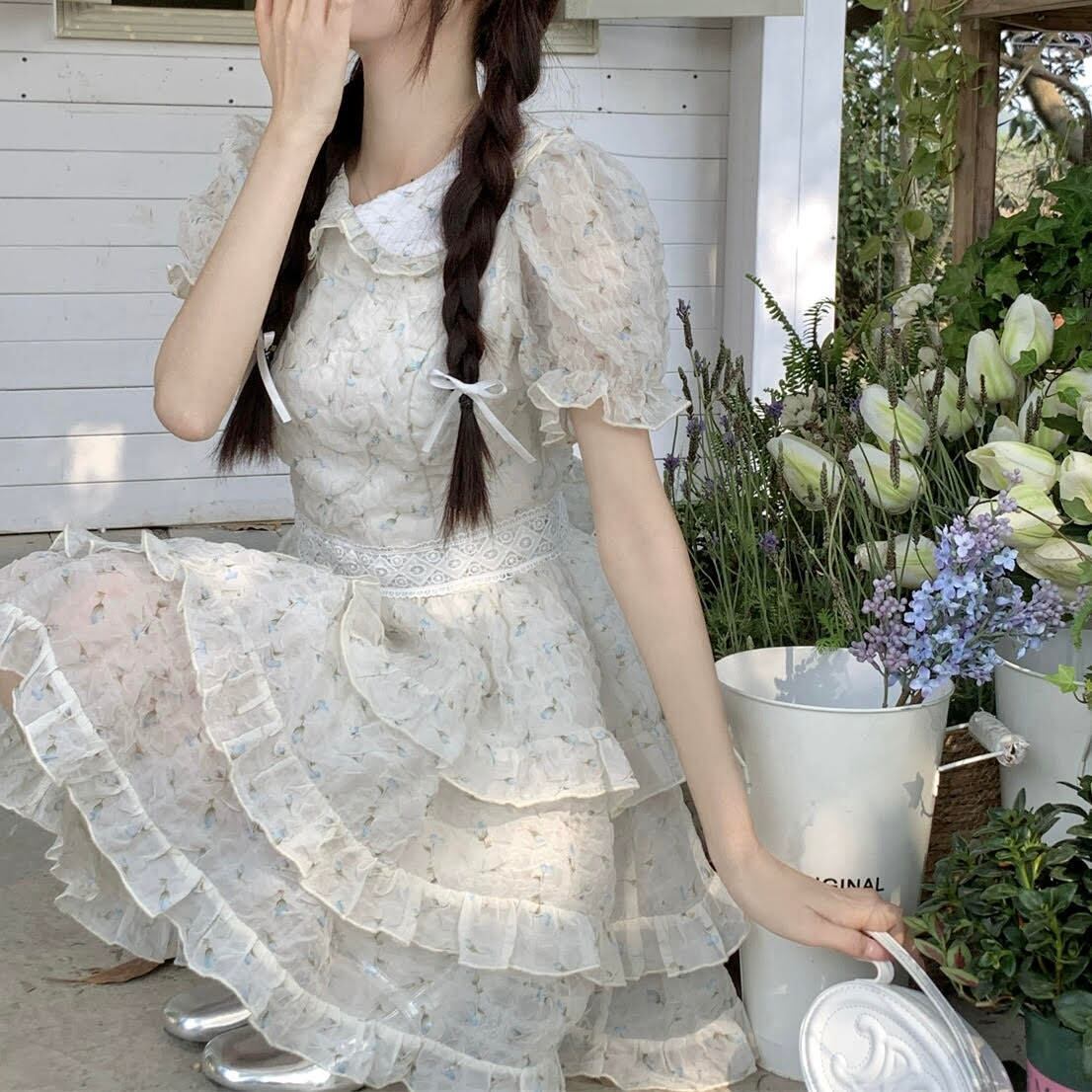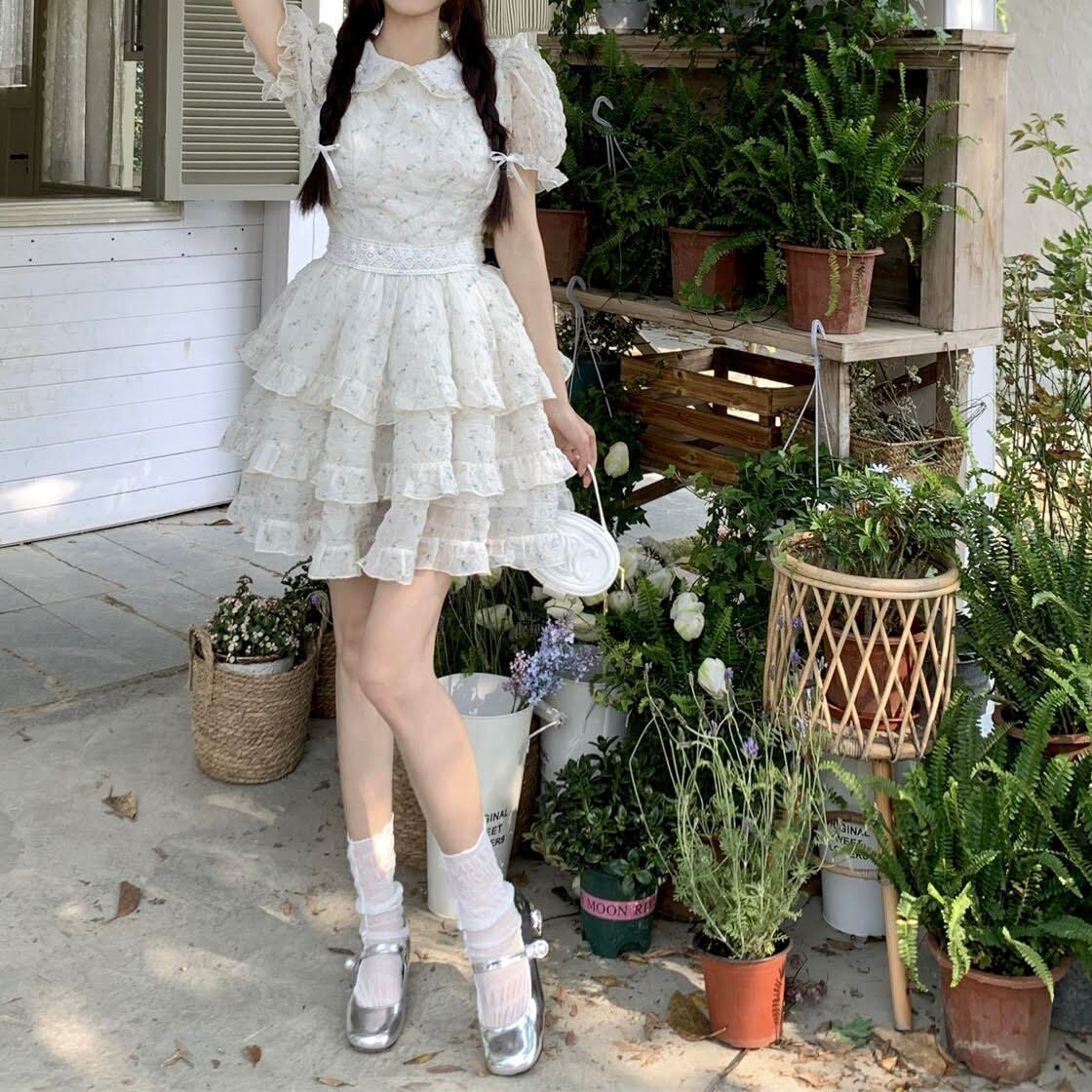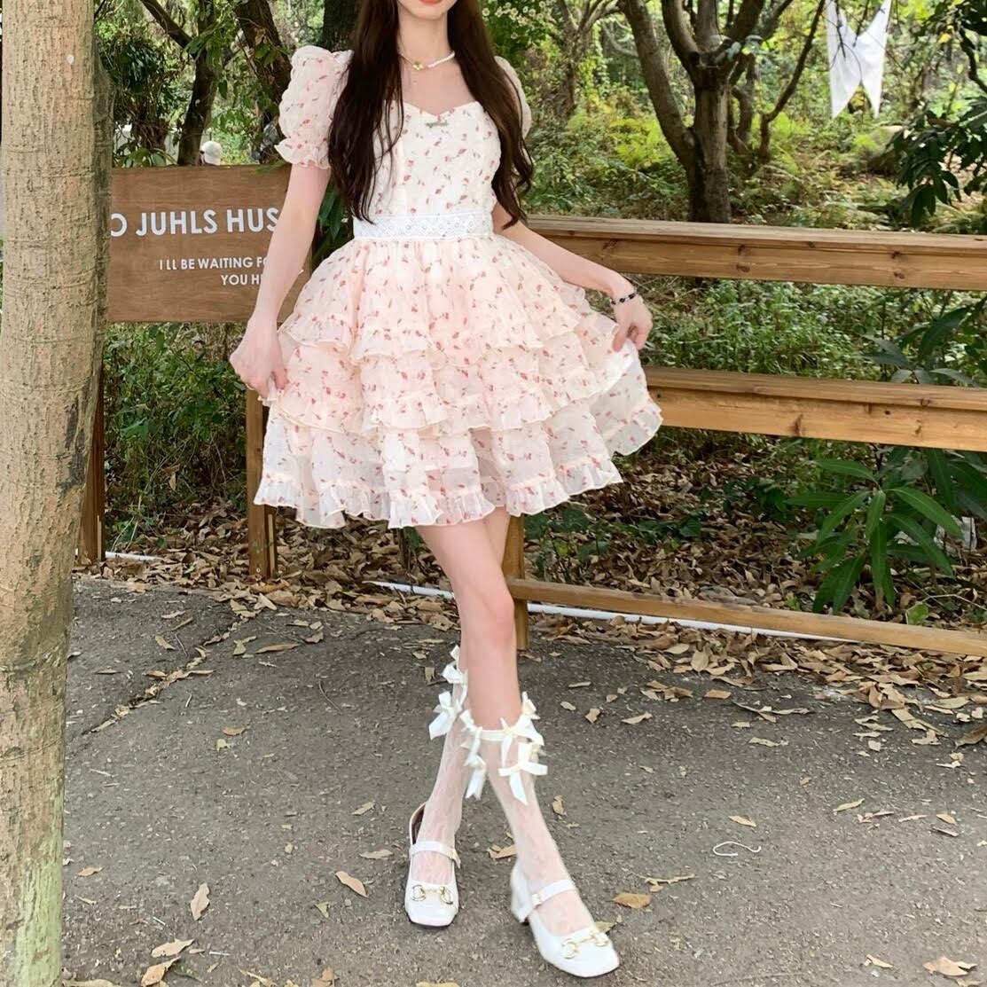 レディース ワンピース 半袖 パフスリーブ スクエアネック ケーキスカート バックリボン ショート丈 Aライン 花柄 ハイウエスト スリム 細身 きれいめ 上品 おしゃれ お洒落 大人可愛い 大人女子 シンプル カジュアル かっこいい エレガント キュート ラブリー ガーリー フェミニン レトロ 主役級 存在感 こなれ感 抜け感 春 夏 10代 20代 お出かけ デート 女子会 お泊まり 普段使い 韓国 オルチャン ファッション コーデ スタイル インスタ映え XS S M L XL ピンク ブルー