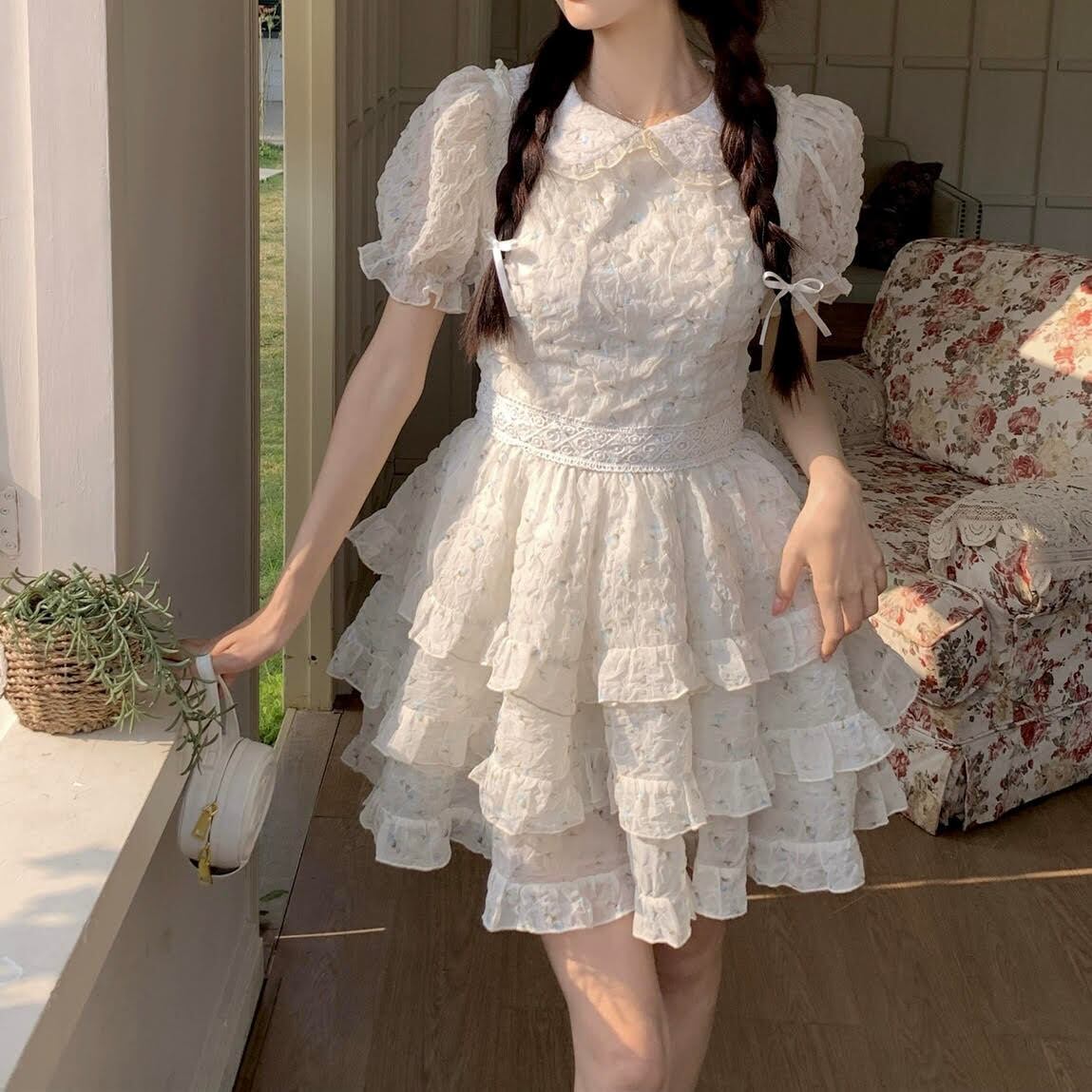 ハートをくすぐる可愛らしさが魅力のショート丈ワンピースです。半袖のパフスリーブとスクエアネックが女性らしさを引き立て、ケーキスカートのAラインシルエットがスリムな印象を与えます。ハイウエストで脚長効果も期待でき、花柄のデザインが春夏らしい爽やかさを演出。バックリボンが上品なアクセントとなり、どこかレトロな雰囲気も醸し出しています。