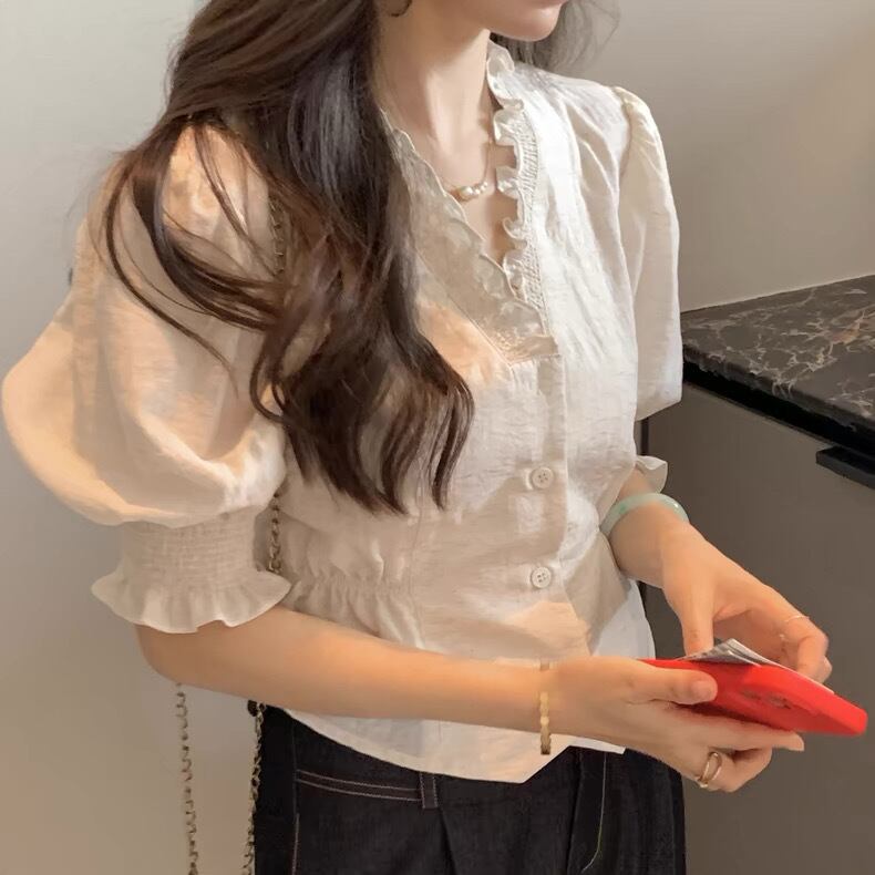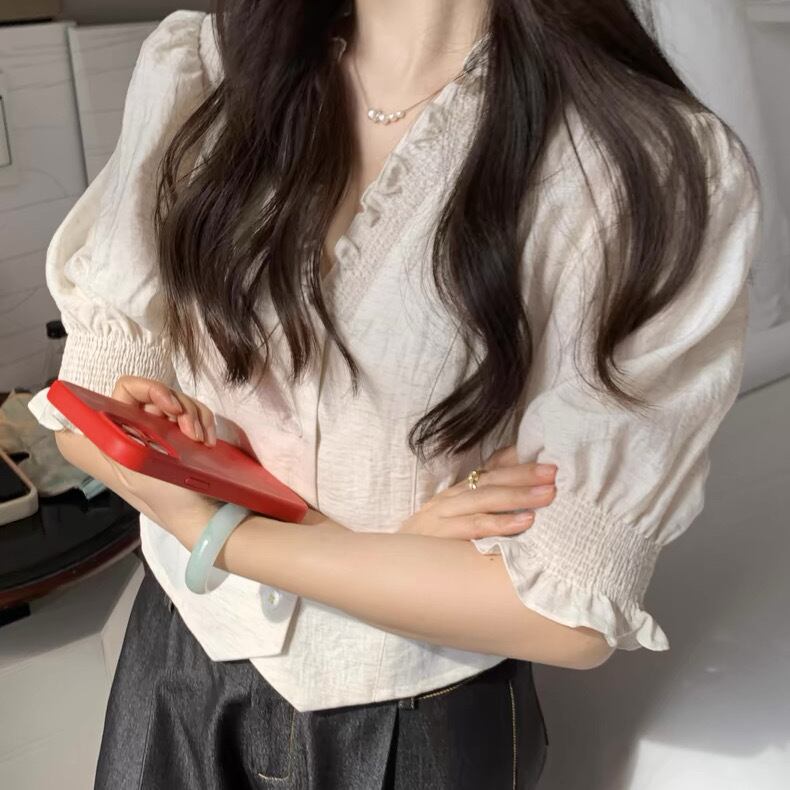 レディース トップス ブラウス 前開き 5分袖 パフスリーブ フレアスリーブ バルーン袖 プリーツパフ Vネック スリム ストレート フェミニン フリル ボタン ギャザー 薄手 かわいい 大人可愛い きれいめ シンプル カジュアル おしゃれ レトロ ガーリー 抜け感 キュート クラシカル ロマンティック ナチュラル 無地 春 夏 ママ デート お出かけ 公園 女子会 休日 ガーデン ショッピング お花見 カフェ 韓国 オルチャン コーデ スタイル 普段使い 着回し モテ サイズ XS S M ベージュ
