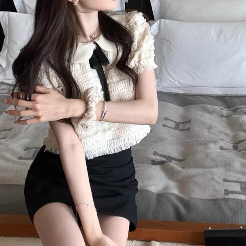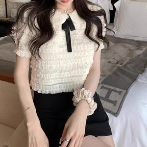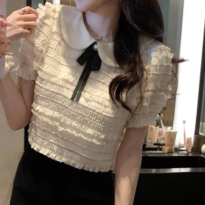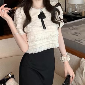 レディース トップス ブラウス ショート 半袖 パフスリーブ フリル袖 プリーツパフ ラウンドネック 襟付き 丸襟 ボウタイ りぼんタイ スリム 細身 ストレート フォーマル フェミニン フリル リボン 配色 かわいい 大人可愛い きれいめ 上品 おしゃれ ガーリー エレガント 主役級 ヴィンテージ ラブリー キュート ロリータ プリンセス クラシカル ロマンティック ドーリー 無地 春 夏 学生 デート お出かけ 公園 女子会 ショッピング 韓国 オルチャン コーデ 普段使い 着回し S アプリコット