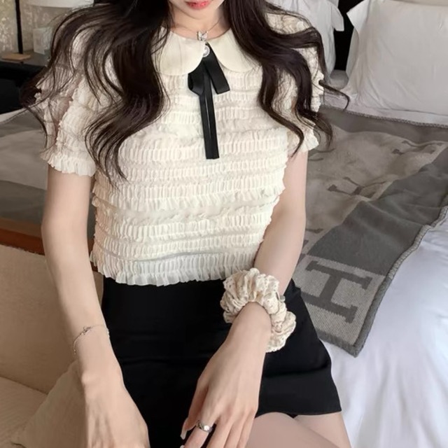 アプリコットカラーが魅力的な、ショート丈の甘めブラウス。