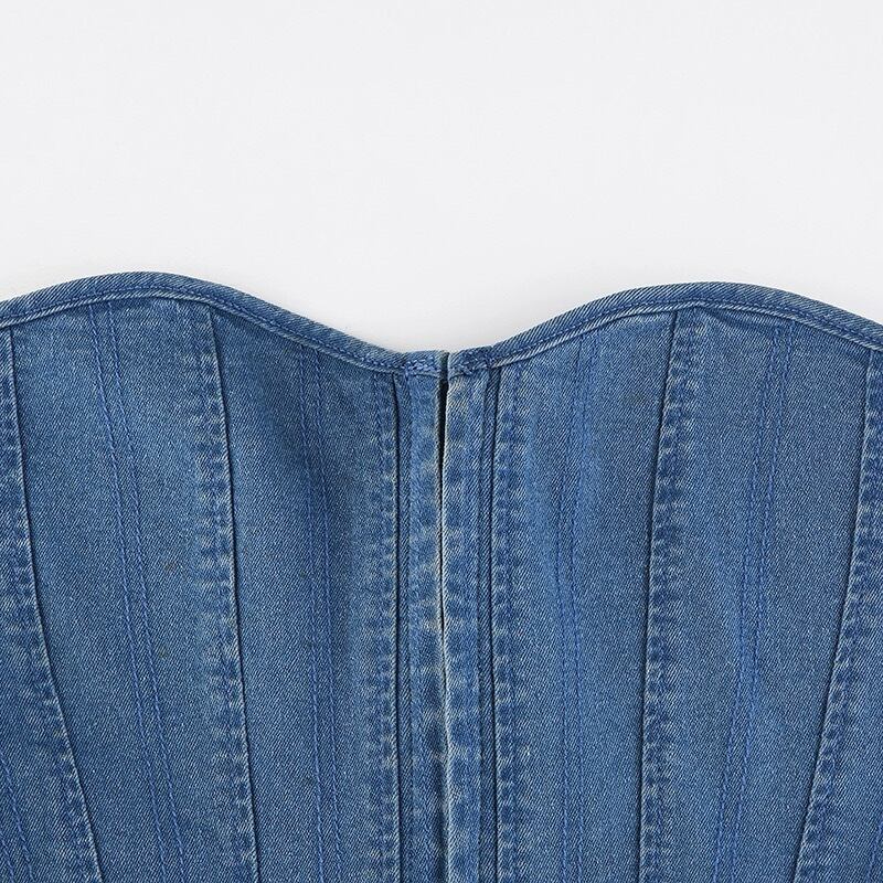 レディース トップス デニム コルセット ベアトップ チューブトップ ショート 袖なし ノースリーブ タイト スリム 細身 ストレート ストリート リボン レースアップ ヴィンテージ アメカジ フロントホック ブルーデニム きれいめ シンプル カジュアル おしゃれ かっこいい 個性的 クール セクシー アメリカン ワイルド 無地 春 夏 デート お出かけ リゾート 海 プール ビーチ 公園 女子会 休日 バカンス ガーデン ショッピング 韓国 コーデ スタイル 普段使い 着回し S M L ブルー 青