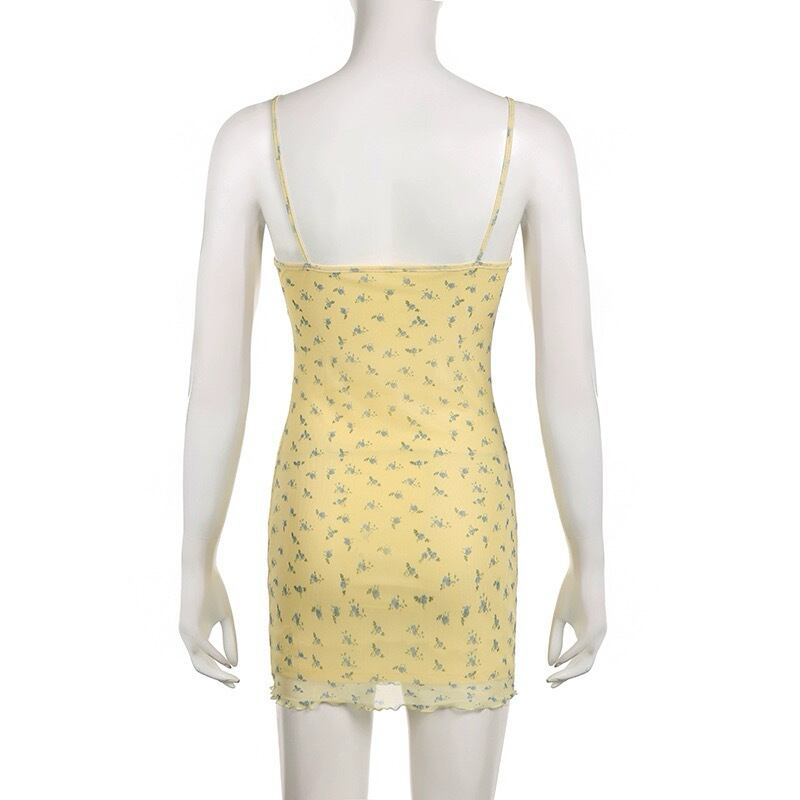 レディース スカート ワンピース キャミソール ミニスカート ミニ 袖なし ノースリーブ ラウンドネック タイト スリム 細身 ストレート Iライン フェミニン フリル リボン ハイウエスト スリムフィット 透け感 メロー 薄手 かわいい 大人可愛い カジュアル おしゃれ レトロ ラフ ガーリー キュート アメリカン セクシー 海外 花柄 フラワー プリント 春 夏 お出かけ リゾート 旅行 海 プール ビーチ 休日 ショッピング 韓国 オルチャン コーデ 美脚 脚長 普段使い S M L 黄色 イエロー
