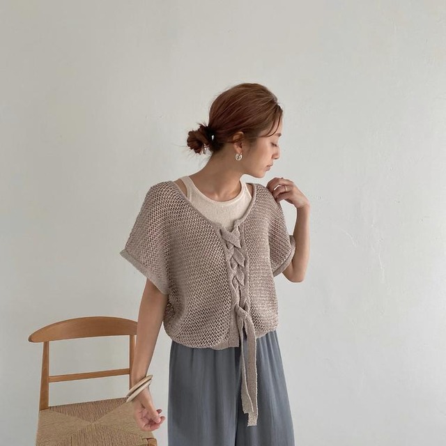 大人可愛いニットカットソー。ラウンドネックでどんなボトムスとも相性抜群。背中の開きにリボンの編み上げがさりげなく女性らしいアクセント。薄手の透け感が夏にぴったり。