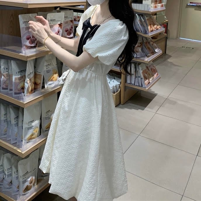 レディース ワンピース 半袖 パフスリーブ スクエアカラー ミモレ丈 リボン Aライン ウエストマーク ハイウエスト スリム 細身 きれいめ 上品 おしゃれ お洒落 大人可愛い 大人女子 シンプル カジュアル かっこいい エレガント キュート ラブリー ガーリー フェミニン レトロ 主役級 存在感 こなれ感 抜け感 夏 10代 20代 お出かけ デート 女子会 お泊まり 旅行 休日 普段使い 韓国系 オルチャン ファッション コーデ 美スタイル インスタ映え 脚長 美脚 S M L XL アプリコット