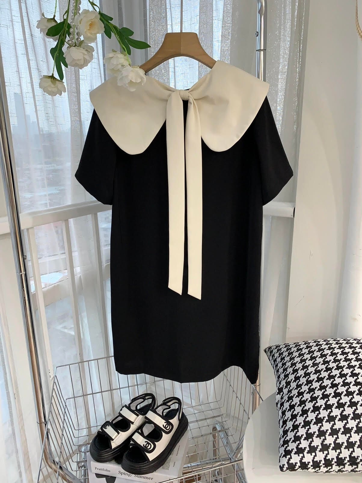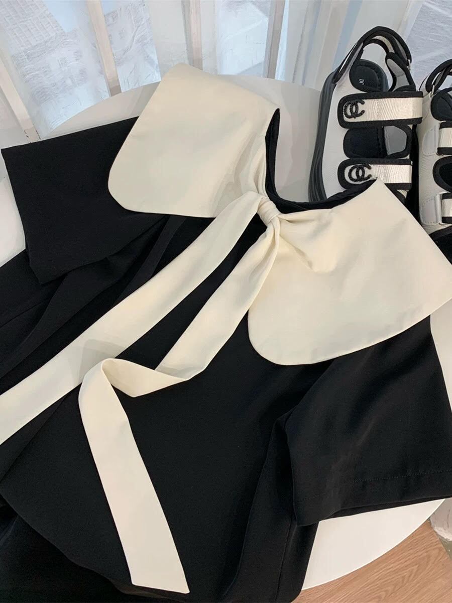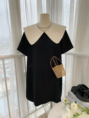 レディース ワンピース 半袖 ラウンドネック 膝丈 襟付き ドールカラー バックリボン Aライン 無地 ハイウエスト ルーズ きれいめ 上品 おしゃれ お洒落 大人可愛い 大人女子 シンプル カジュアル かっこいい エレガント キュート ラブリー ガーリー フェミニン レトロ 主役級 存在感 こなれ感 抜け感 夏 10代 20代 お出かけ デート 女子会 お泊まり 旅行 休日 普段使い 韓国 オルチャン ファッション コーデ スタイルアップ 美スタイル インスタ映え 脚長 美脚 S M L ブラック