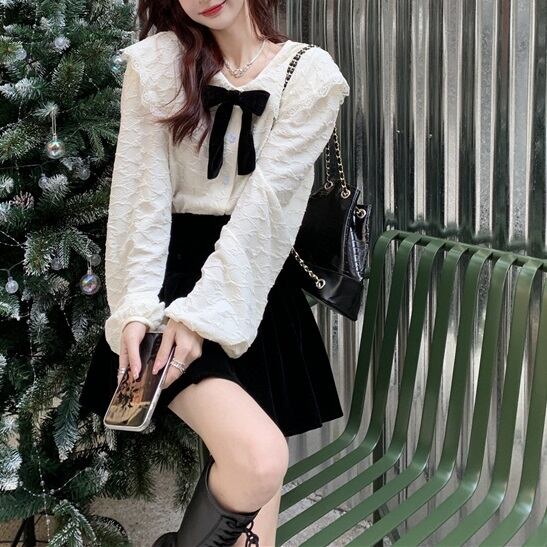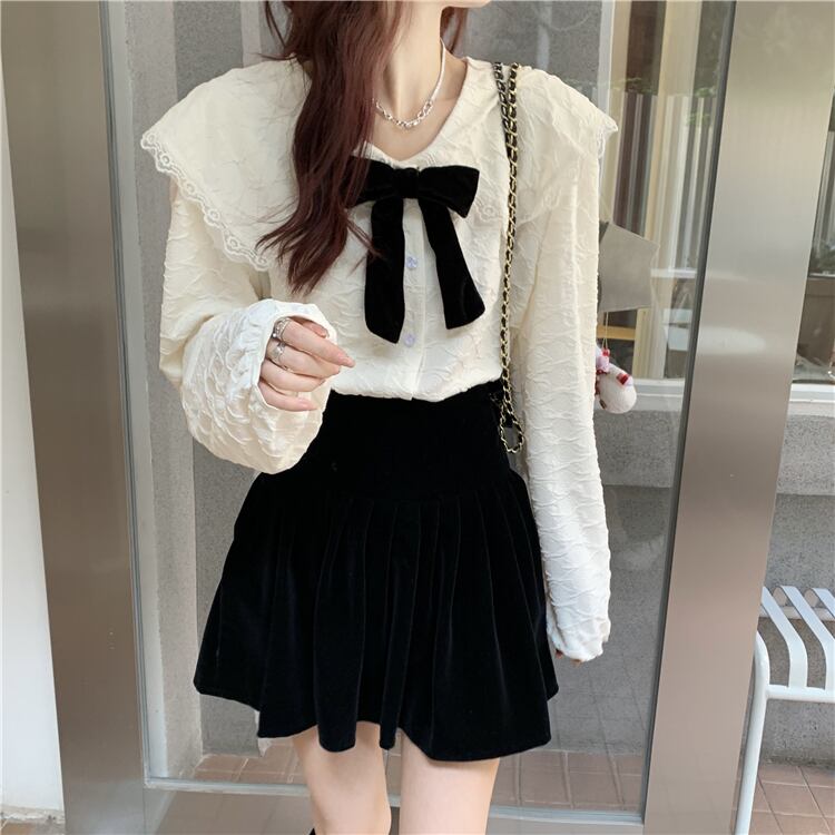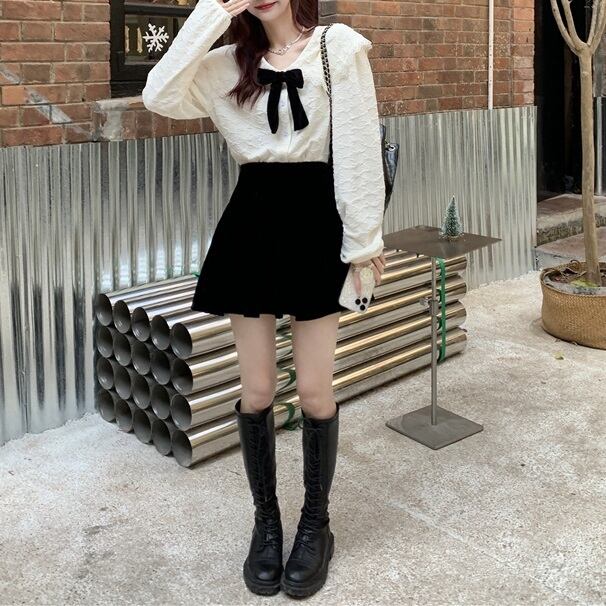 シックで可愛らしいセットアップが登場しました!ラウンドネックにりぼんタイがついた長袖シャツと、ハイウエストのAラインスカートがセットになっています。女性らしいフェミニンなデザインで、上品な雰囲気を演出します。