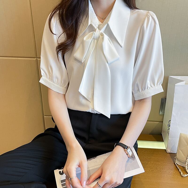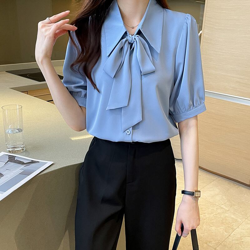 レディース シャツ 半袖 パフスリーブ 襟付き ポロカラー りぼんタイ フェミニン リボン 透け感 薄手 かわいい 大人可愛い きれいめ シンプル 上品 おしゃれ こなれ感 ラフ ルーズ 存在感 フォーマル クラシカル ロマンティック ナチュラル 無地 夏 会議 ミーティング ママ ビジネス OL 通勤 通学 デート お出かけ レストラン 女子会 休日 ショッピング カフェ 楽ちん 体型カバー 普段使い 着回し モテ 清楚 インスタ映え S M L XL 2XL 白 ホワイト ブルー ベーシックカラー