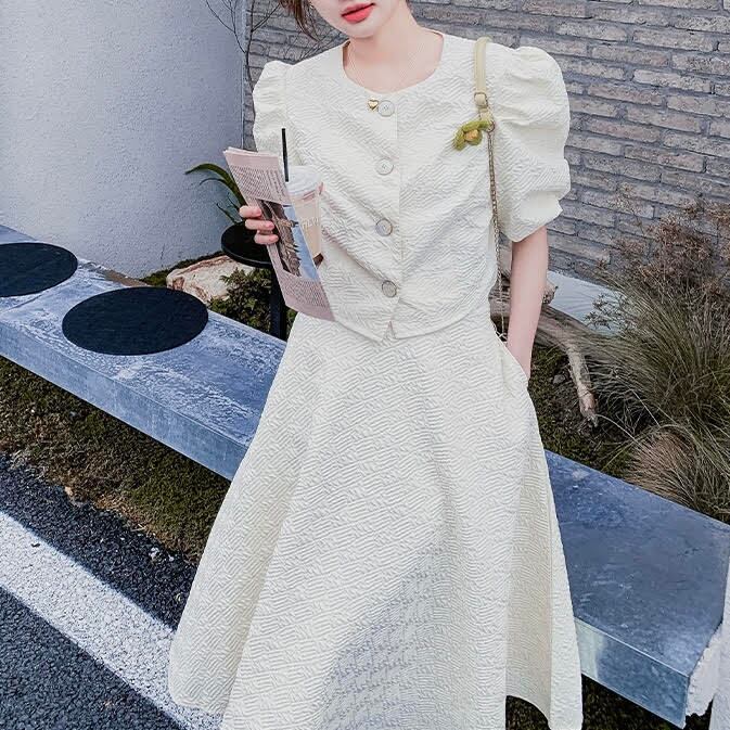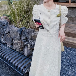 レディース セットアップ トップス 半袖 パフスリーブ ラウンドネック ボタン 前開き スカート ロング丈 ポケット Aライン ハイウエスト 2点セット 上下セット スリム 細身 きれいめ 上品 おしゃれ お洒落 大人可愛い 大人女子 シンプル カジュアル かっこいい エレガント クール モダン シック レトロ 主役級 存在感 こなれ感 抜け感 夏 20代 30代 40代 お出かけ デート 女子会 お泊まり 旅行 普段使い 韓国 オルチャン ファッション コーデ インスタ映え S M L オフホワイト