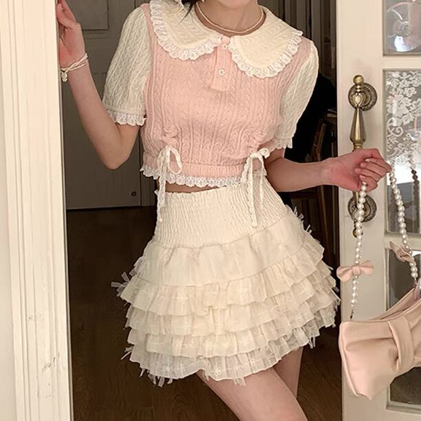 レディース トップス カットソー ニットソー サマーセーター サマーニット ショート 半袖 パフスリーブ フリル袖 バルーン袖 ラウンドネック 襟付き 丸襟 スリム フェミニン レース フリル リボン ハイウエスト ケーブルニット 伸縮性 ボタン 配色 かわいい カジュアル おしゃれ ガーリー ラブリー キュート ロリータ ロマンティック 甘め ドーリー 無地 春 夏 デート お出かけ 公園 女子会 休日 ガーデン ショッピング 韓国 コーデ スタイル 脚長 普段使い 着回し サイズ S M L ピンク