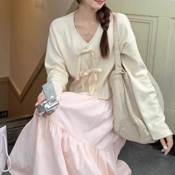 Vネックにリボンが施された可愛らしいデザインで、ショート丈と落ち感、ルーズ感がおしゃれな雰囲気を演出します。