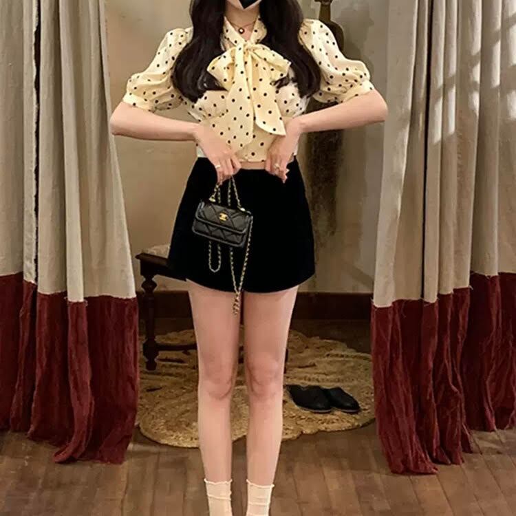 レディース トップス ブラウス シャツ 半袖 Vネック ボウタイ リボン ショート丈 ボタン 前開き ドット柄 スリム 細身 きれいめ 上品 おしゃれ お洒落 大人可愛い 大人女子 シンプル カジュアル かっこいい エレガント クール シック モダン フェミニン レトロ 主役級 存在感 こなれ感 抜け感 夏 20代 30代 お出かけ デート 女子会 ショッピング レストラン 旅行 お泊まり 休日 普段使い 韓国 韓国系 オルチャン ファッション コーデ スタイルアップ インスタ映え S M L シャンパン