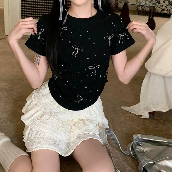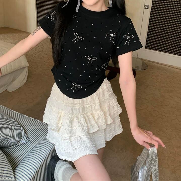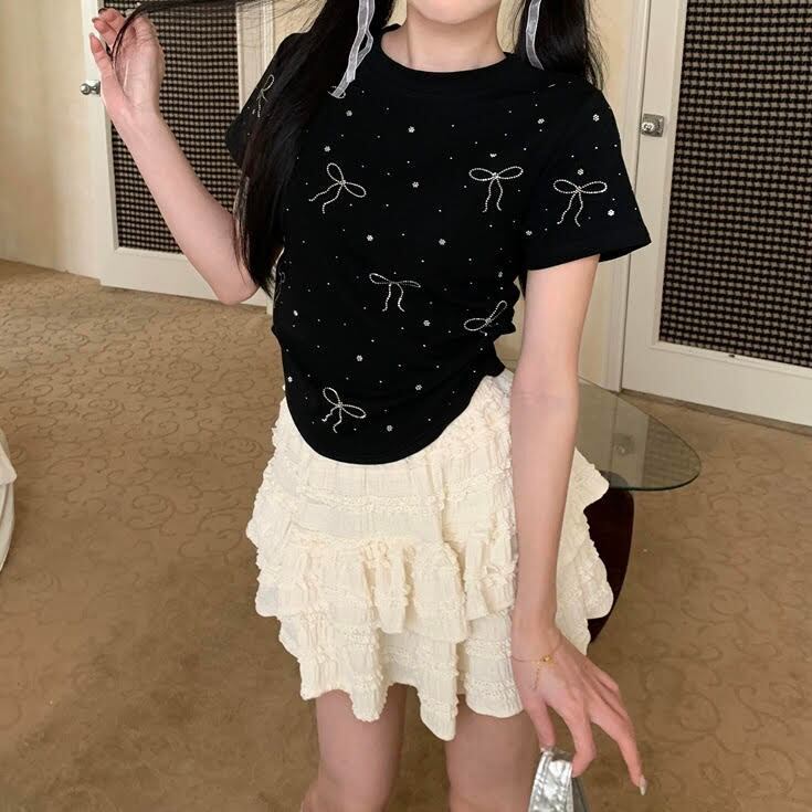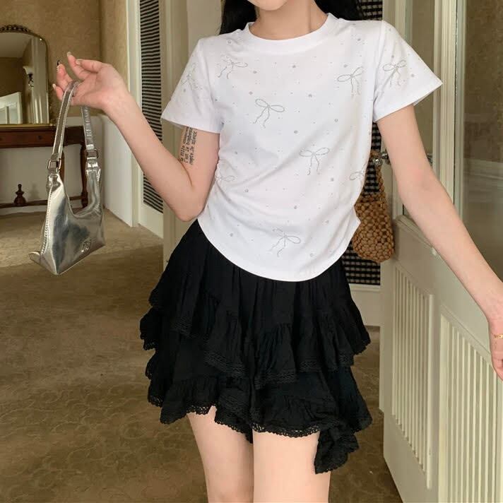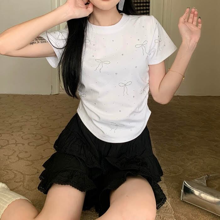 レディース トップス Tシャツ 半袖 リボン柄 ラウンドネック プルオーバー スリム 細身 きれいめ 上品 おしゃれ お洒落 大人可愛い 大人女子 シンプル カジュアル かっこいい エレガント キュート ラブリー ガーリー フェミニン レトロ 主役級 存在感 こなれ感 抜け感 夏 10代 20代 30代 40代 お出かけ デート 女子会 ショッピング レストラン 旅行 お泊まり 休日 普段使い デイリー 韓国 韓国系 オルチャン ファッション コーデ スタイル インスタ映え ワンサイズ ホワイト ブラック